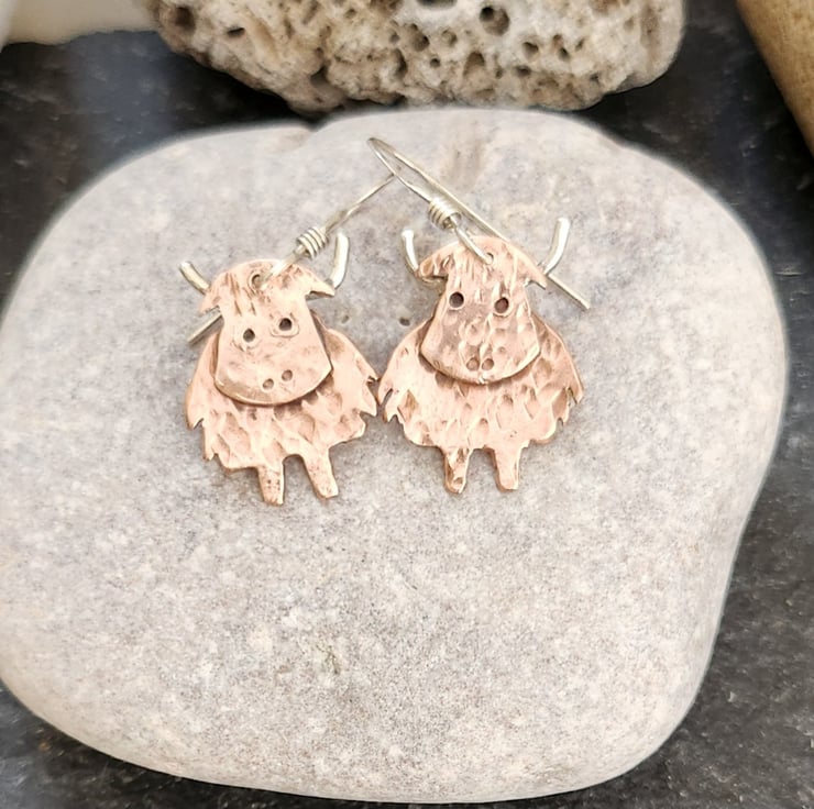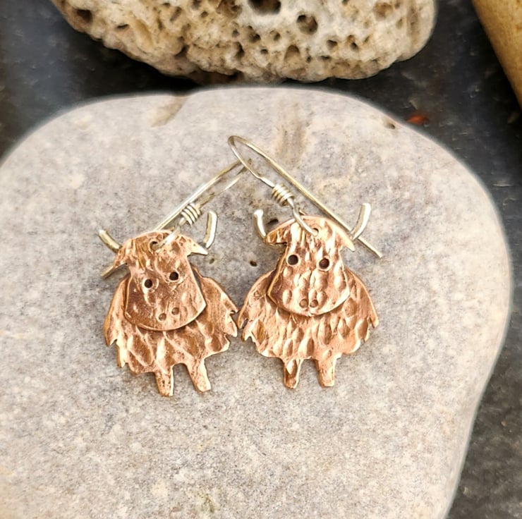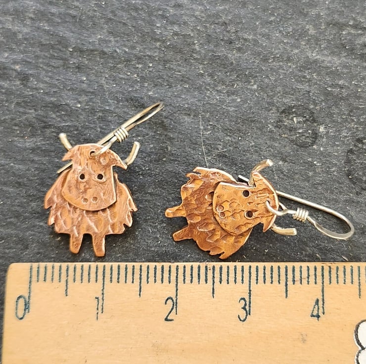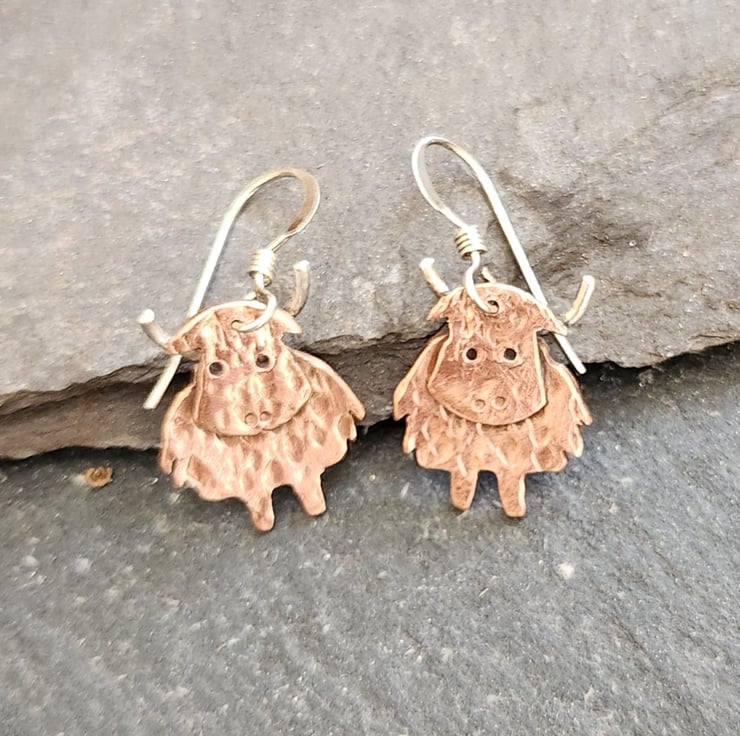 Highland cows cut from copper sheet and roughly textured. Sterling silver horns and ear hooks. Approximately 1.6cms tall, excluding horns.