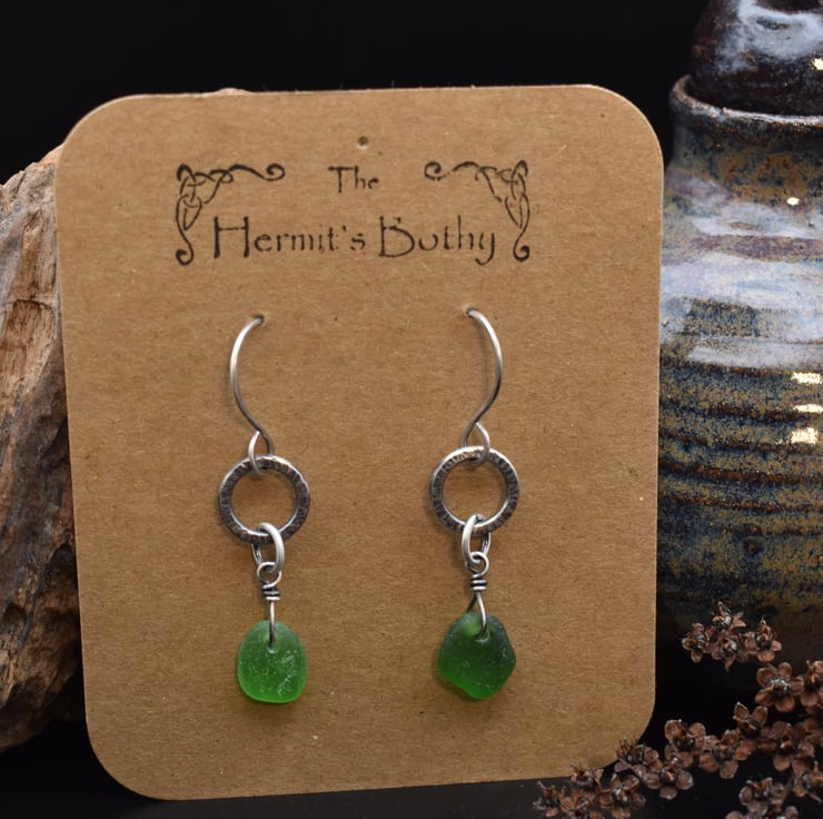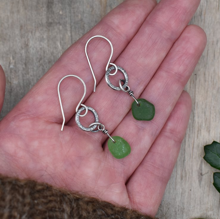 These earrings have been made using recycled sterling silver, and sea glass collected from a local Highland beach. Each earring features a small piece of bright green sea glass suspended beneath a small sterling silver 925 hoop that has been hammered for texture. They measure approximately 4.5cm from the top of the hook, and have a 'dangle length' (from the bottom of the hook) of just less than 3cm. The sterling silver components have been oxidised using liver of sulphur to give an antiqued finish.