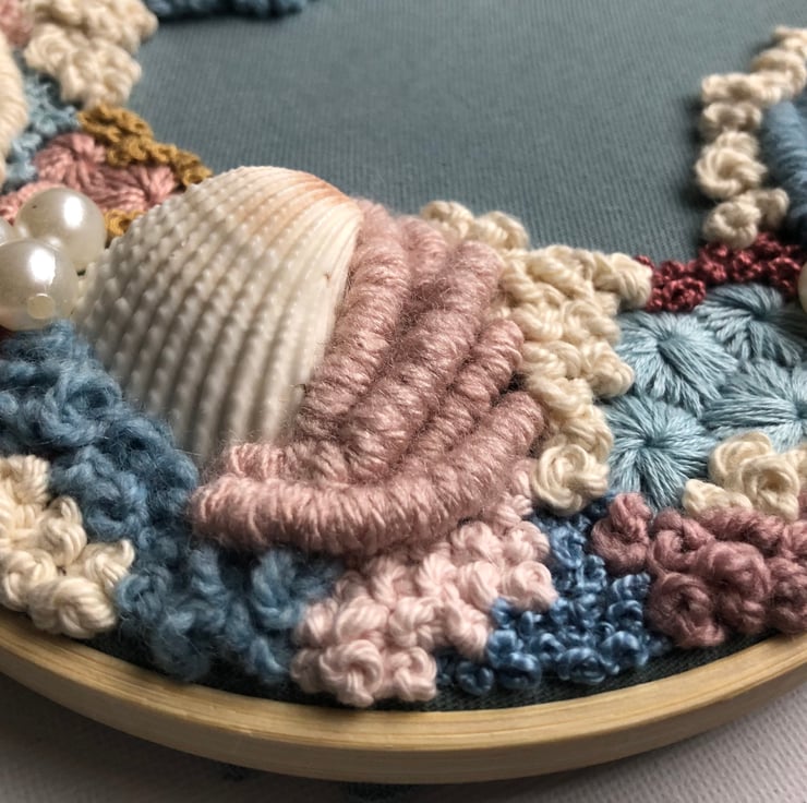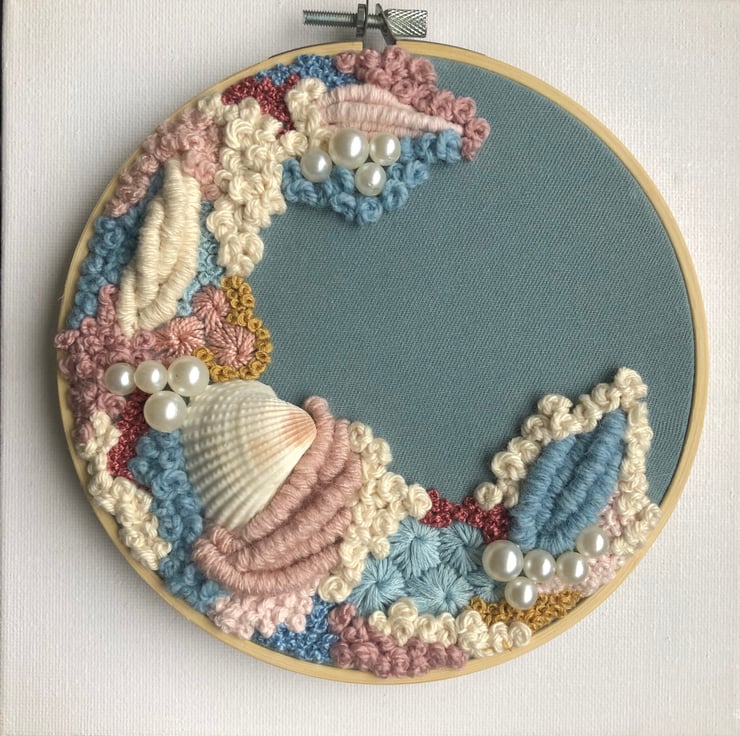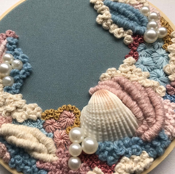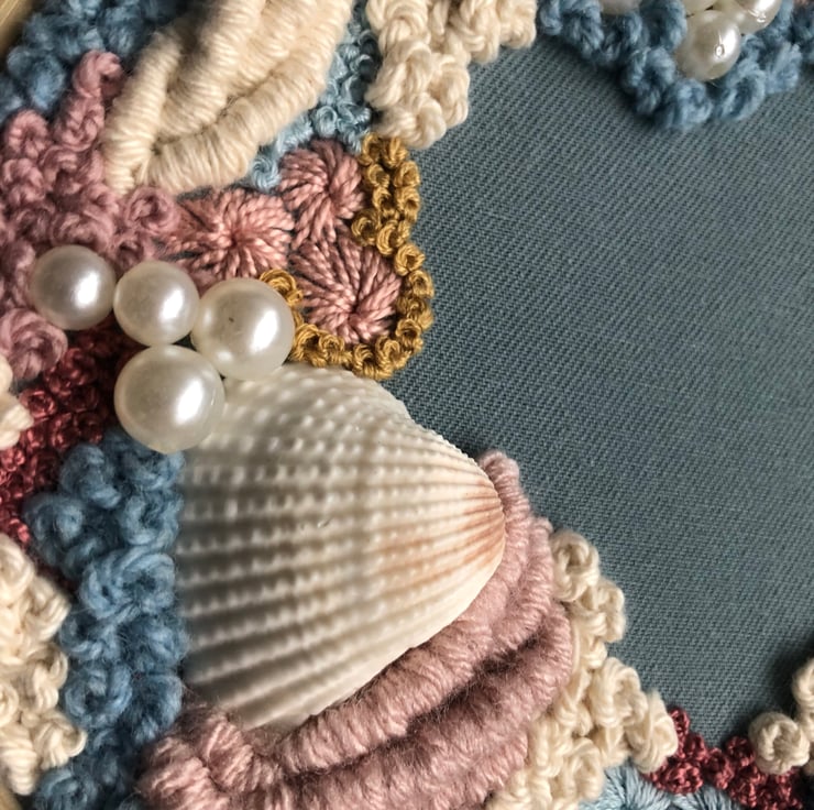 oceanic ll a one of a kind 6 inch hand embroidered art piece. Yarn, embroidery thread, shell and beads have been hand stitched into a pale teal blue fabric in an abstract pattern. This has created a piece of art which is both eye catching and unique a perfect addition to any home.