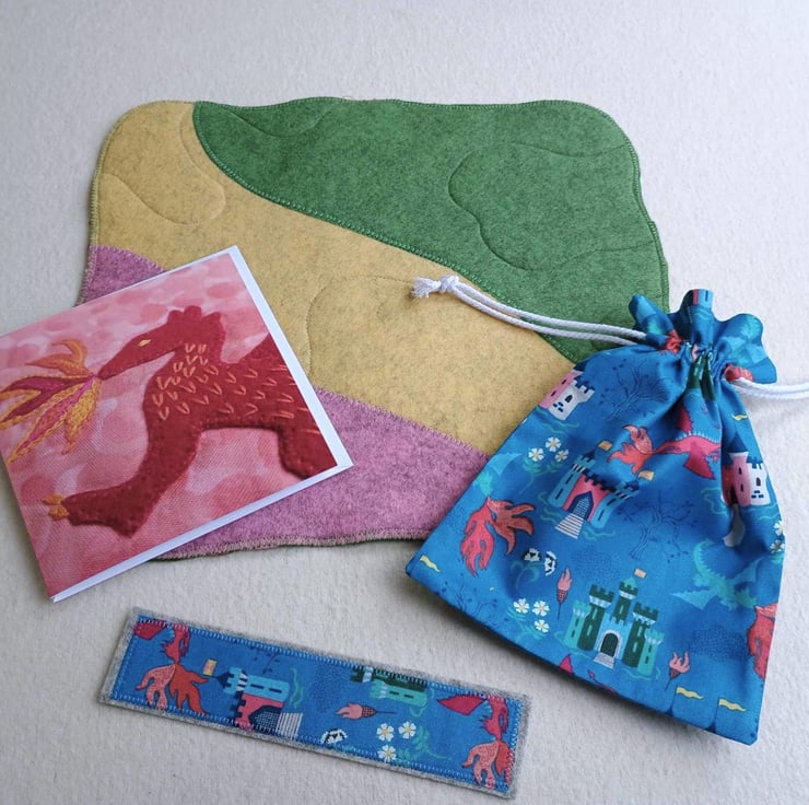 The gift box is based around a reversible felt playmat with two different scenes - perfect for both themed and open ended play. It includes a lined cotton drawstring bag to hold your child's little toy figures and a felt bookmark to use with fairy-tale books. I've also added one of my printed cards featuring my hand embroidered dragon for a special message, and there are optional extras.