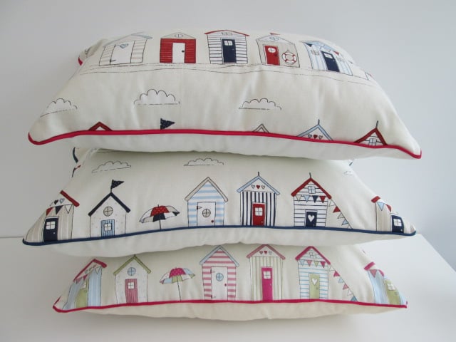 Beach huts cushion with cream back and central zip and red piping.