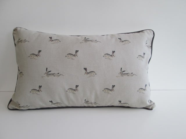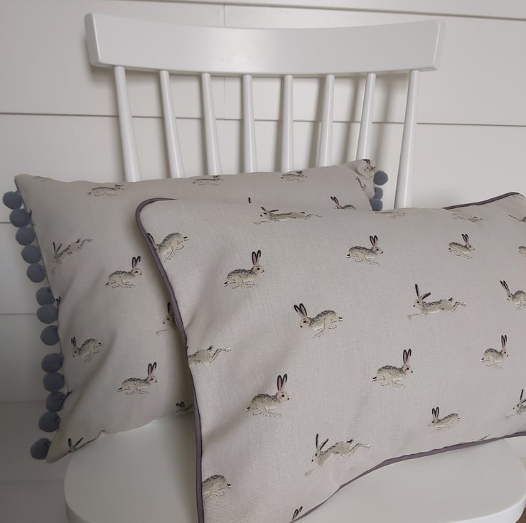 Sophie Allport hares fabric cushion with cream back and central zip and dark grey pom poms