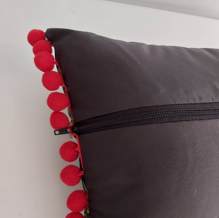 Printed velvet jungle design cushion cover with central zip and red pom poms