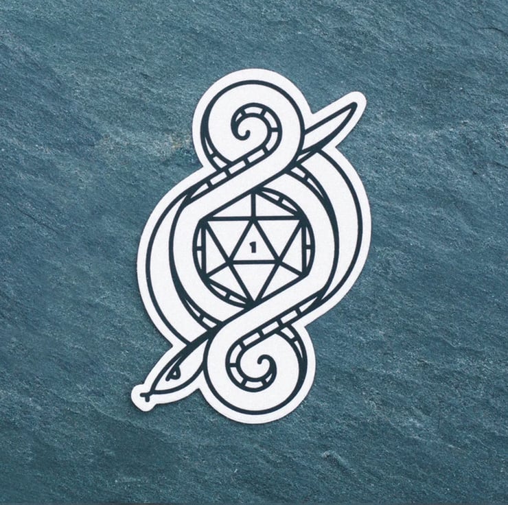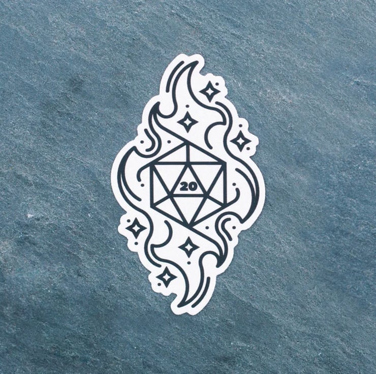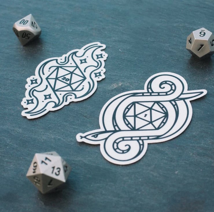 Roll your fate and let the dice decide! A pair of stylish vinyl stickers celebrating the best and worst outcomes of a d20 roll! These stickers measure 5x7.5cm and look awesome on laptops - or keep it low fi and stick one on a folder or notebook.