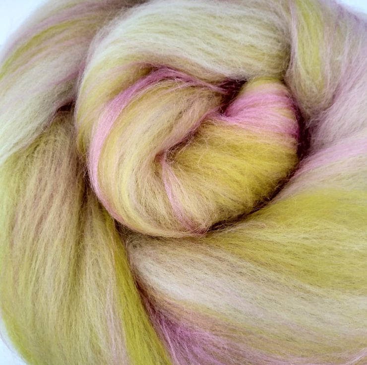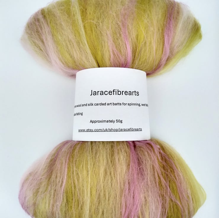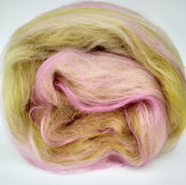Pale yellowy green and pale pink merino wool art batt.50 g. Think of fresh gooseberries or rhubarb. Made to Order.