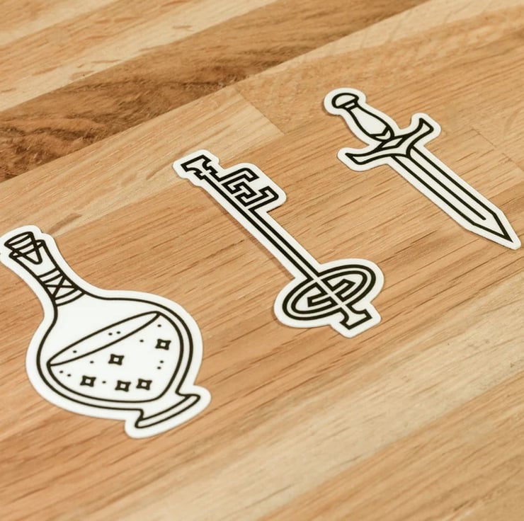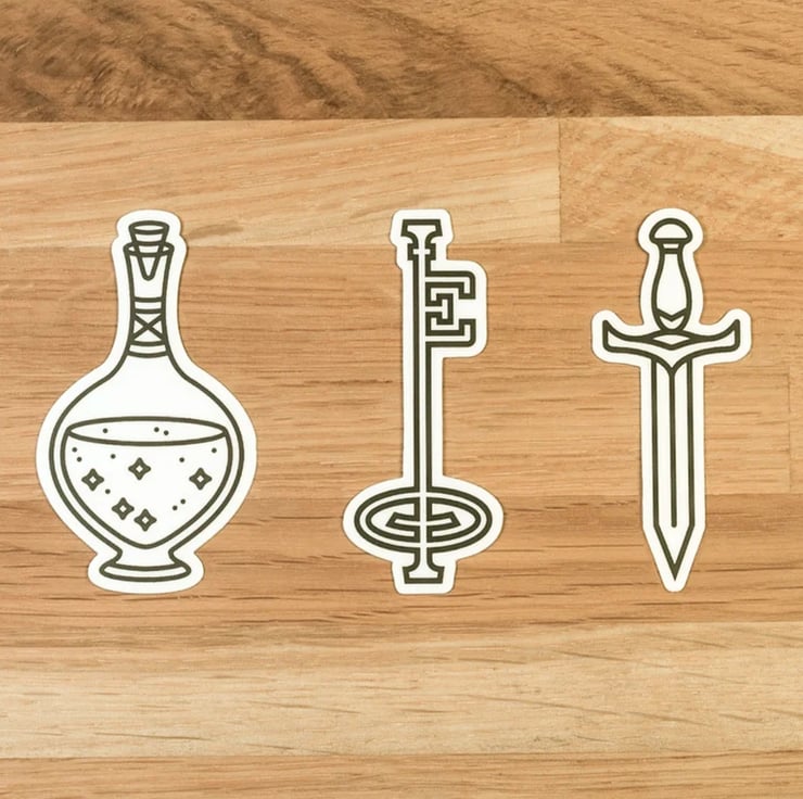 A trio of stylish vinyl stickers featuring some typical adventuring items - a potion, dagger and key. These stickers measure 6cm tall, with the width varying between each design. They look awesome on laptops - or keep it low fi and stick one on a folder or notebook.