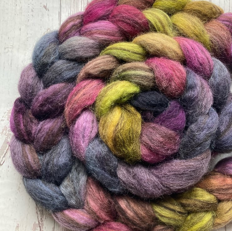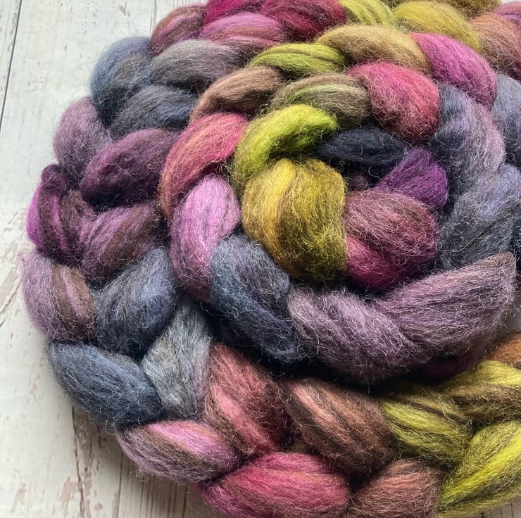 A mix of Shetland moorit, Black Welsh, Cotswold, grey Teeswater and grey Massam. Blended skilfully together by Tom and Ellie at Wingham Wool to make a fantastic medium heathered fibre with both a beautiful crimp and sheen.
