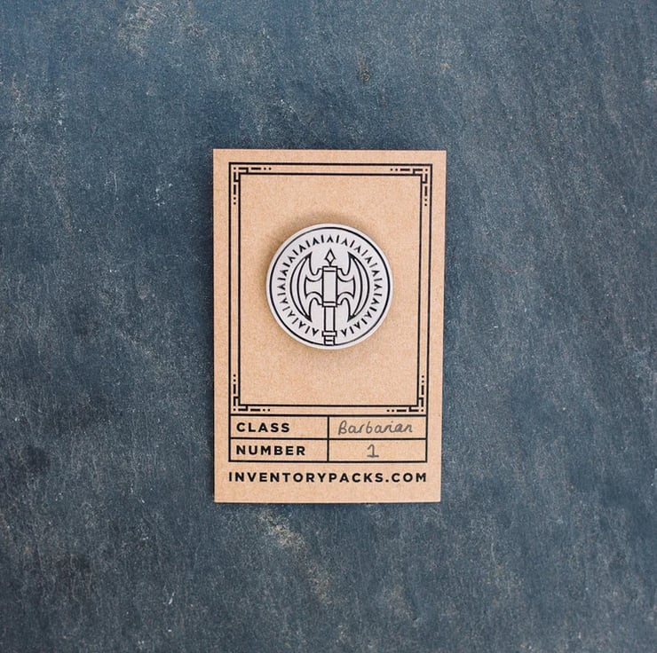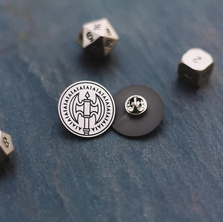 Our Barbarian class icon, as a beautiful silver and black soft-enamel pin!