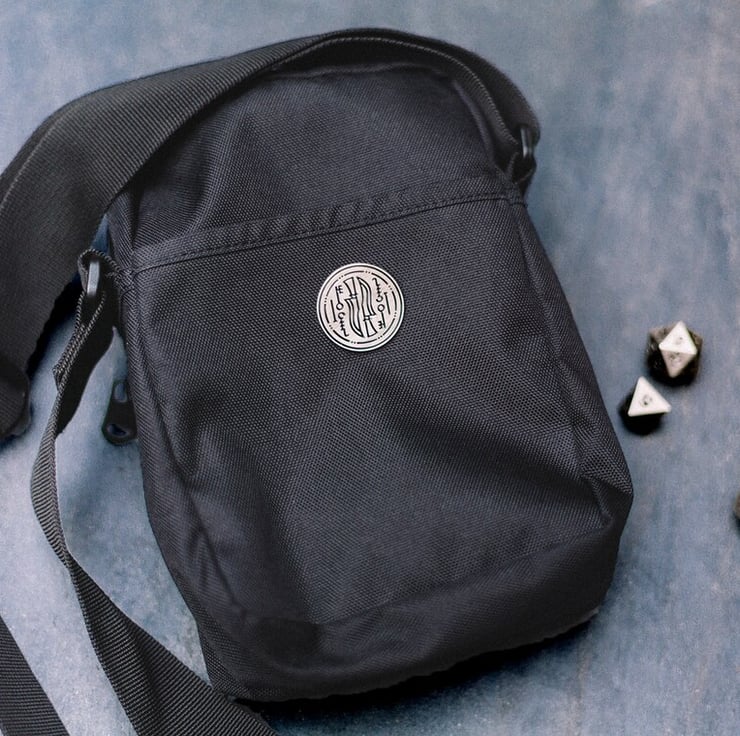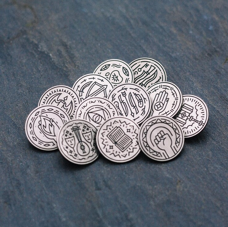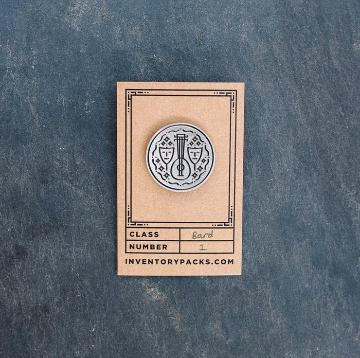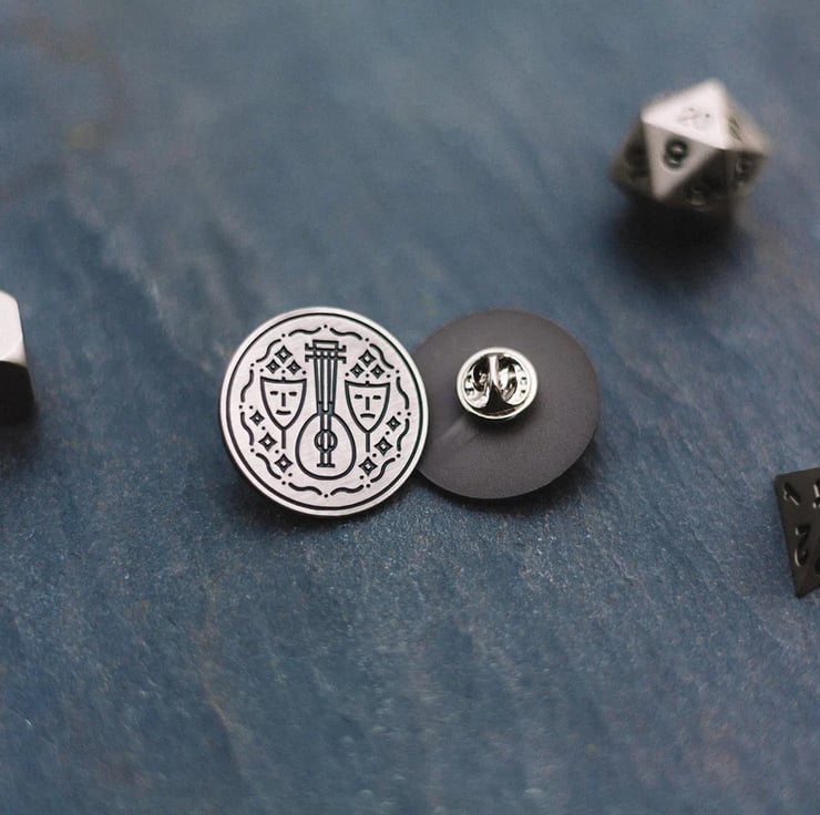 Our Bard class icon, as a beautiful silver and black soft-enamel pin!
