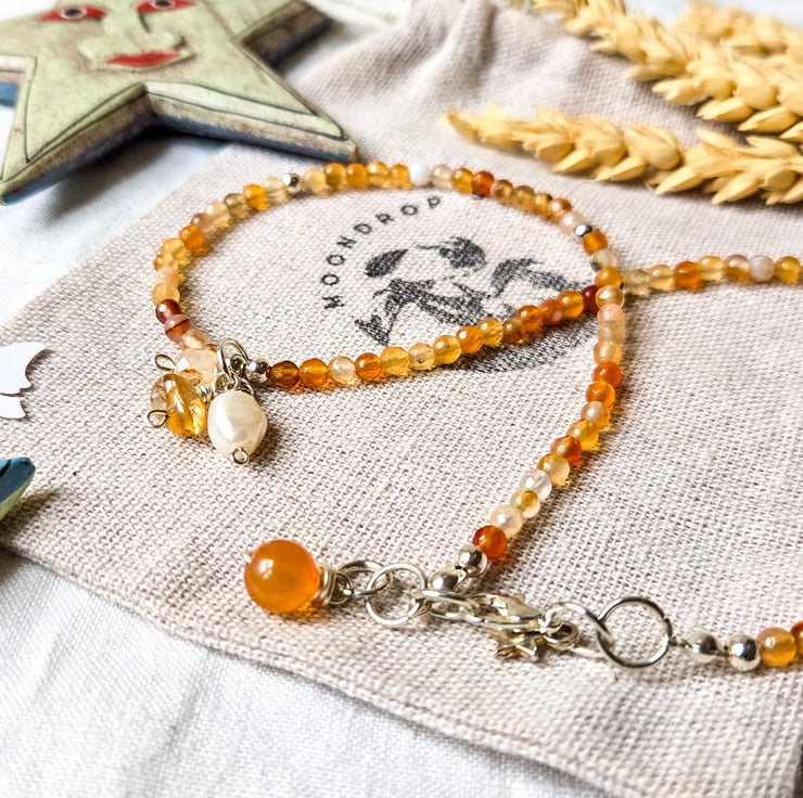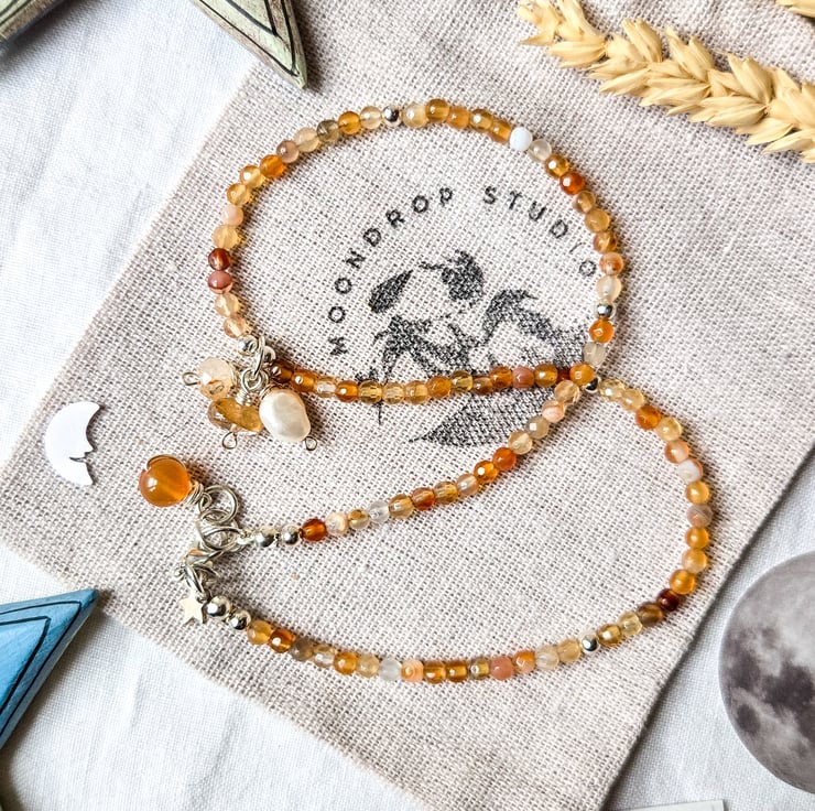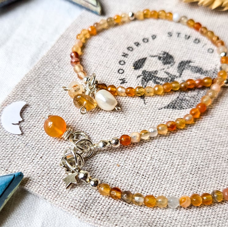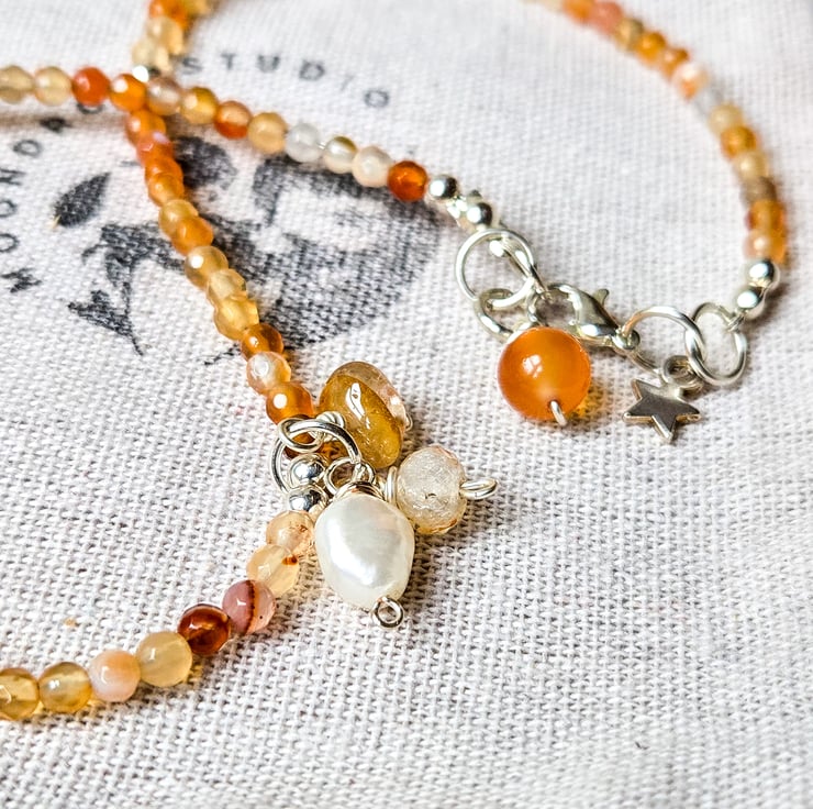 This lovely necklace pairs glowing faceted Carnelian gemstones with a dreamy freshwater pearl and a tiny sterling silver star charm.