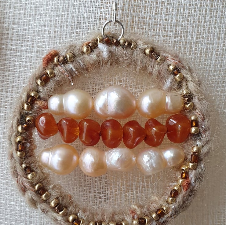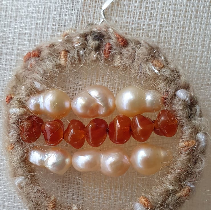The carnelian is cwtched in between two rows of chunky creamy pearls that off set the rusty hues in the wool lperfectly.
