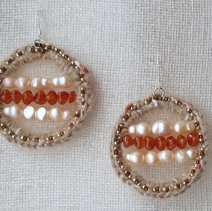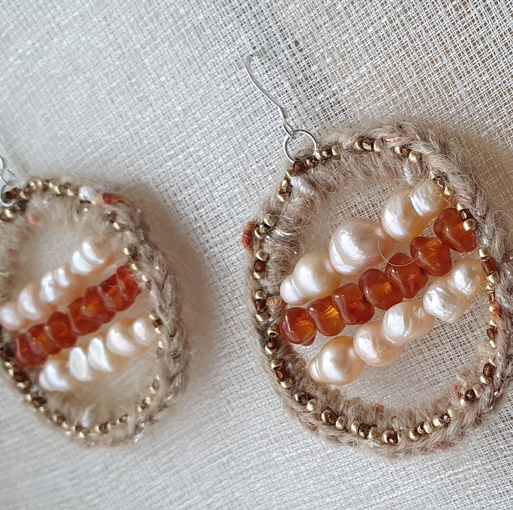 Chunky pearls, carnelian, mohair, 925 silver, miyuki beads and 925 coated hand shaped wire went into making these warm and versatile hoops.