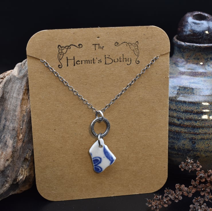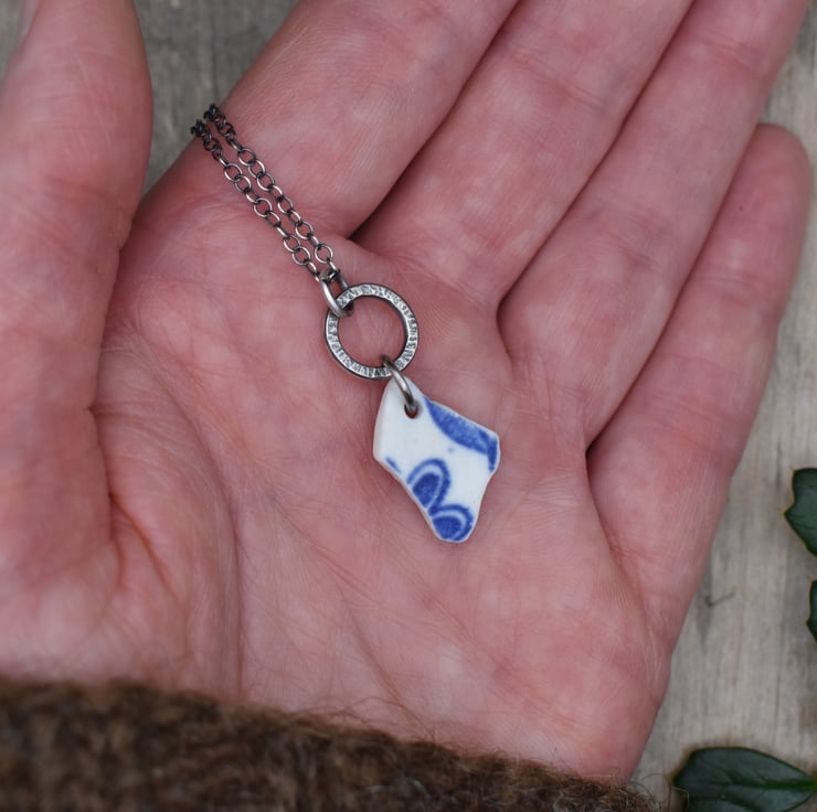 This necklace has been made using recycled sterling silver, and sea pottery collected from a local Highland beach. It features a lovely little piece of blue and white sea pottery, suspended beneath a small sterling silver 925 hoop that has been hammered for texture. All the silver components have been oxidised using liver of sulphur to give an antiqued finish. The pendant comes with a sterling silver trace chain with a bolt ring clasp, in a length of either 45cm (18 inches) or 50cm (20 inches) - please specify when ordering which chain length you would prefer (please refer to length reference photo).