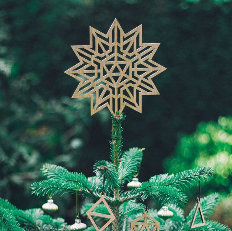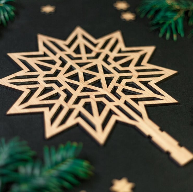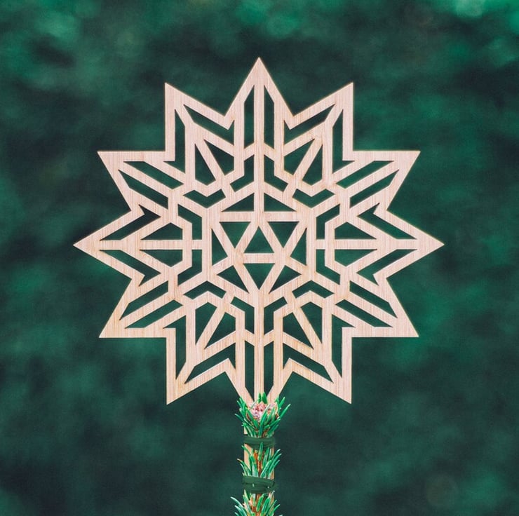 A beautifully intricate star tree topper, with a D20 at its center. Made from sustainable 3mm bamboo, this is the perfect crown for a stylishly geeky Christmas tree!