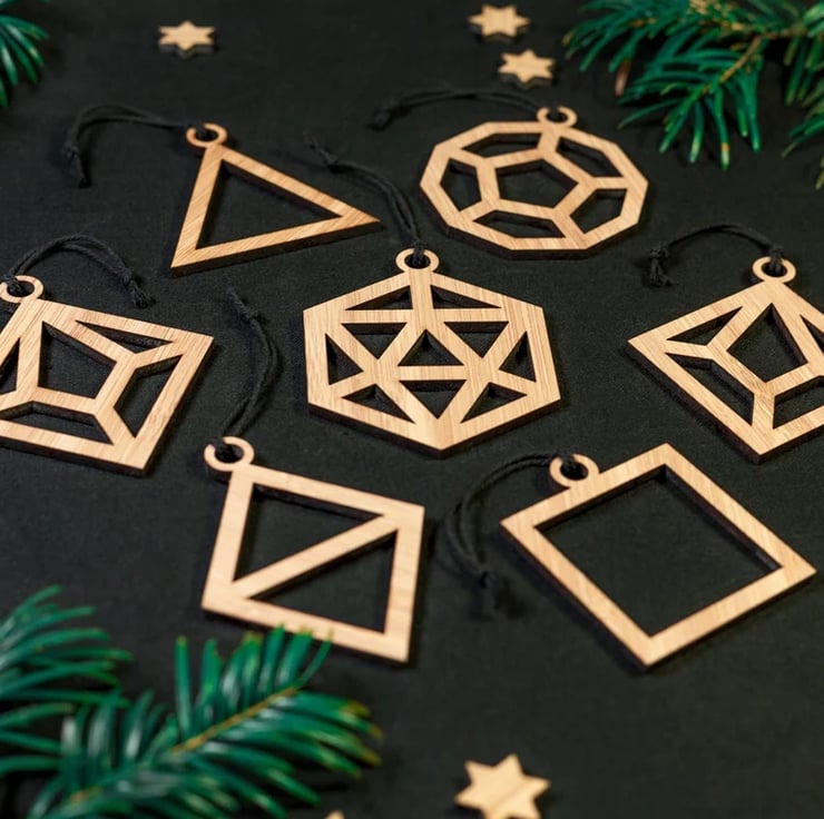 A beautiful set of 7 polyhedral dice decorations, made from sustainable 3mm bamboo and threaded with black recycled cotton twine.