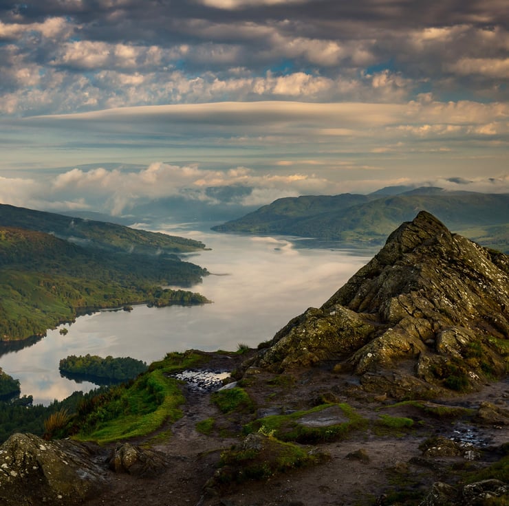 Image: "Loch Katrine Dawn" - Ben Venue & Loch Katrine from Ben A'an in the Trossachs on a misty dawn, 1 July 2015 - by Scotland photographer Neil Barr