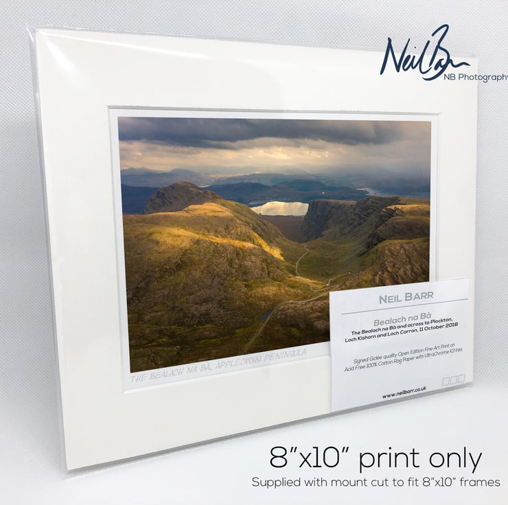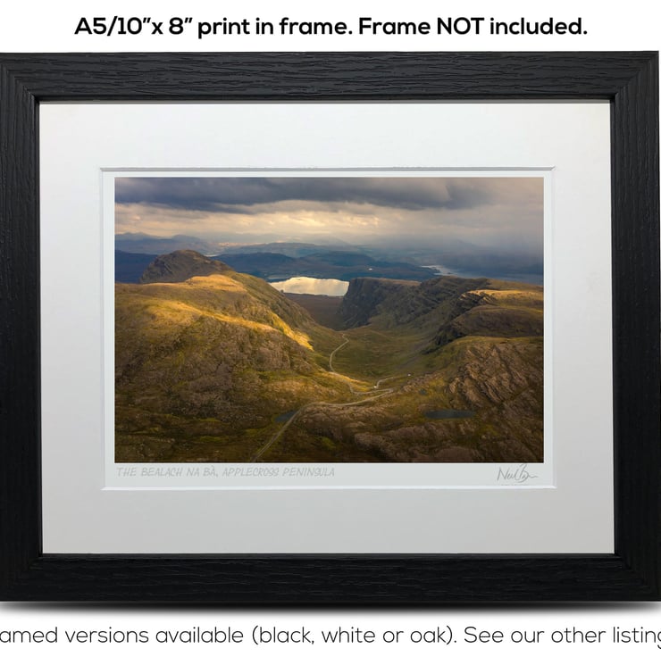 Supplied already mounted, wrapped & with signed labels & certificate, the image is printed on A5 size fine art paper (148x210mm). The actual image size is smaller (see listing images for sizes - image approx. 185x123mm) to allow for the signature & inscription. The 100% acid-free mount is cut to fit standard ready-made frames from high street stores. EXTERNAL mount size is 10"x8". This is the OUTSIDE size of the mount (and thus the size your frame should be).