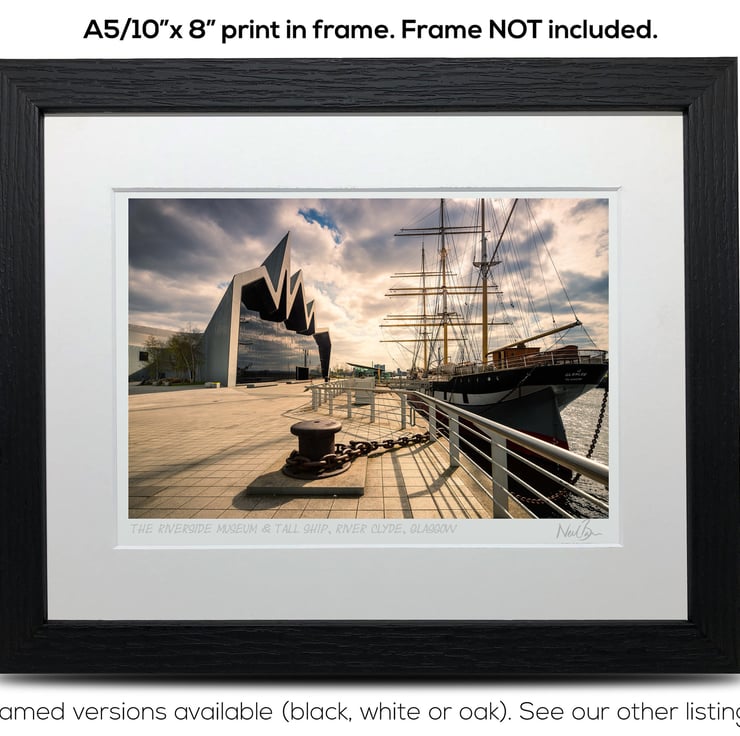 Supplied already mounted, wrapped & with signed labels & certificate, the image is printed on A5 size fine art paper (148x210mm). The actual image size is smaller (see listing images for sizes - image approx. 185x123mm) to allow for the signature & inscription. The 100% acid-free mount is cut to fit standard ready-made frames from high street stores. EXTERNAL mount size is 10"x8". This is the OUTSIDE size of the mount (and thus the size your frame should be).