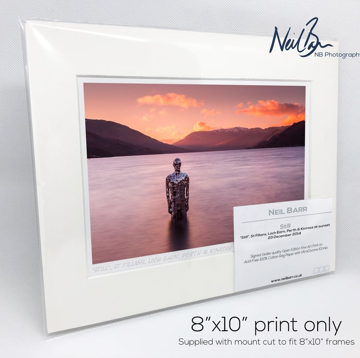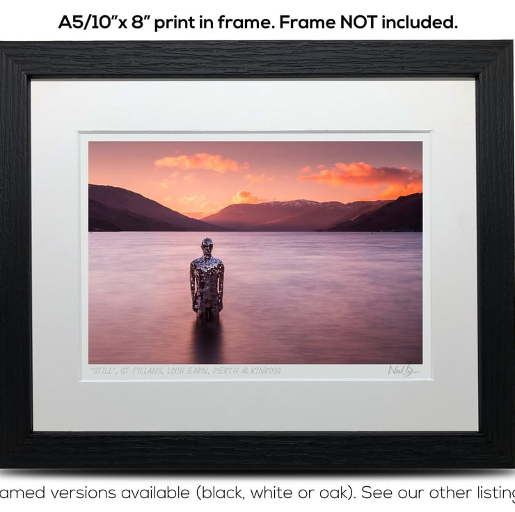 Supplied already mounted, wrapped & with signed labels & certificate, the image is printed on A5 size fine art paper (148x210mm). The actual image size is smaller (see listing images for sizes - image approx. 185x123mm) to allow for the signature & inscription. The 100% acid-free mount is cut to fit standard ready-made frames from high street stores. EXTERNAL mount size is 10"x8". This is the OUTSIDE size of the mount (and thus the size your frame should be).
