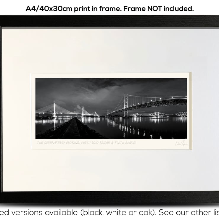 Supplied already mounted, wrapped & with signed labels & certificate, the image is printed on A4 size fine art paper (210x297mm). The actual image size is smaller (see listing images for sizes - image approx. 268x110mm) to allow for the signature & inscription. The 100% acid-free mount is cut to fit standard ready-made frames from high street stores. EXTERNAL mount size is 40cm x 30cm. This is the OUTSIDE size of the mount (and thus the size your frame should be).