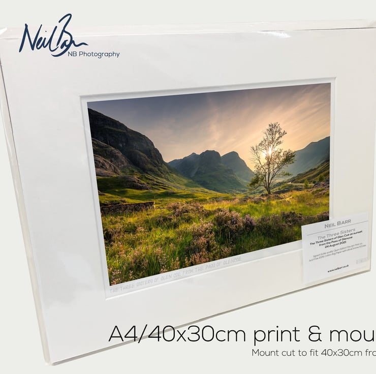 Supplied already mounted, wrapped & with signed labels & certificate, the image is printed on A4 size fine art paper (210x297mm). The actual image size is smaller (see listing images for sizes - image approx. 268x179mm) to allow for the signature & inscription. The 100% acid-free mount is cut to fit standard ready-made frames from high street stores. EXTERNAL mount size is 40cm x 30cm. This is the OUTSIDE size of the mount (and thus the size your frame should be).