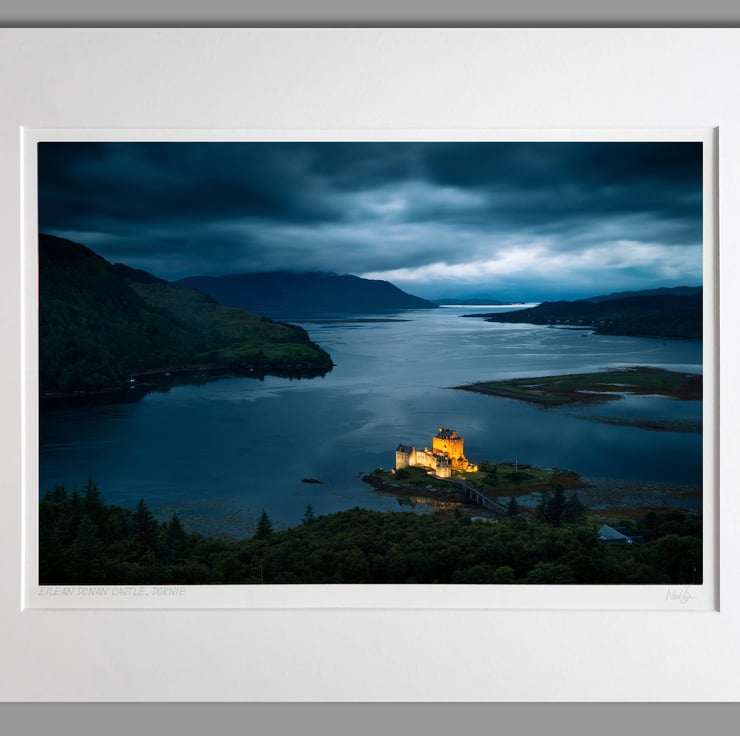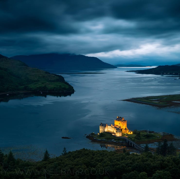 Image: "Eilean Donan in Blue" - Eilean Donan Castle at Dornie, Loch Alsh and in the far distance the Skye Bridge, 28 June 2016 - by Scotland photographer Neil Barr