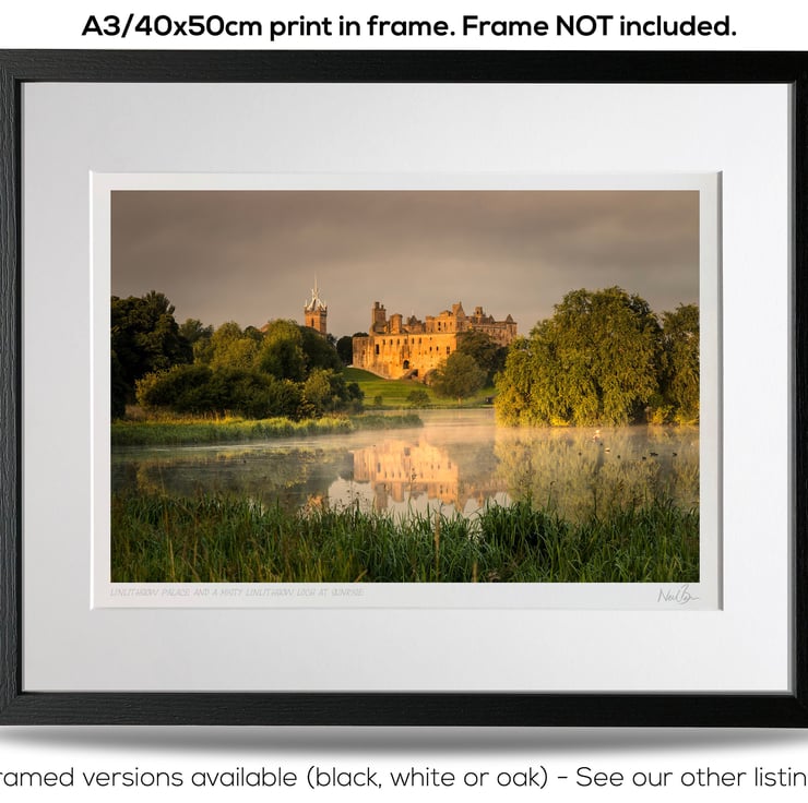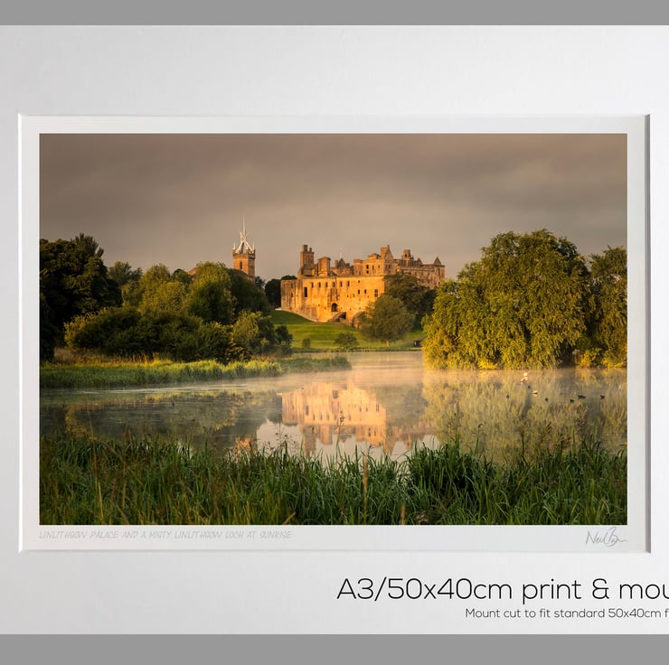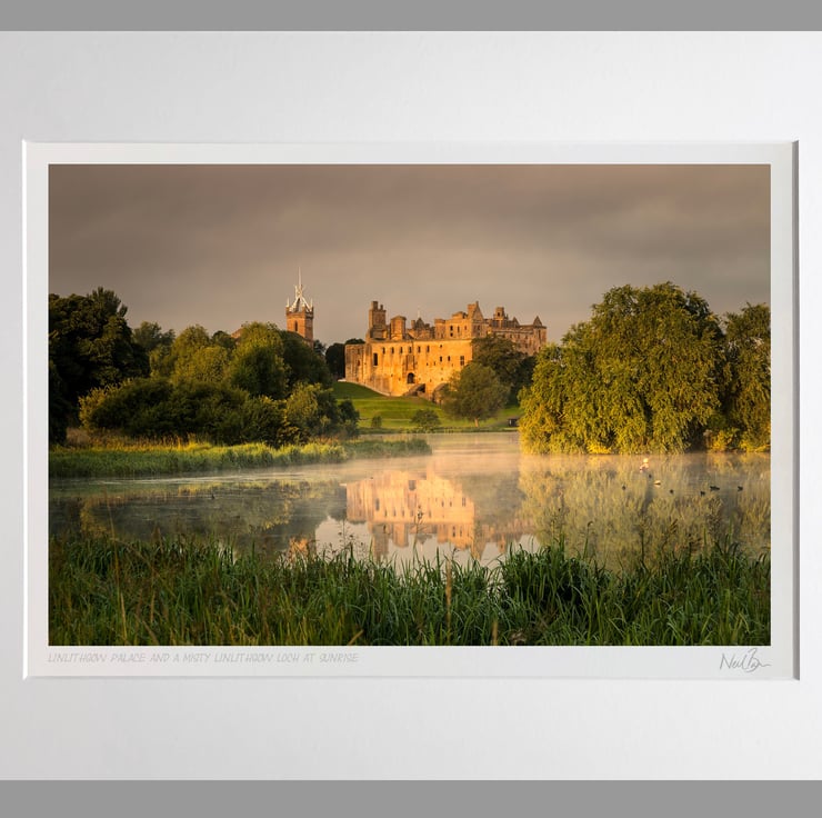 Image: "Linlithgow Palace" - Linlithgow Palace and a misty Linlithgow Loch at sunrise, 31 August 2018 - by Scotland photographer Neil Barr