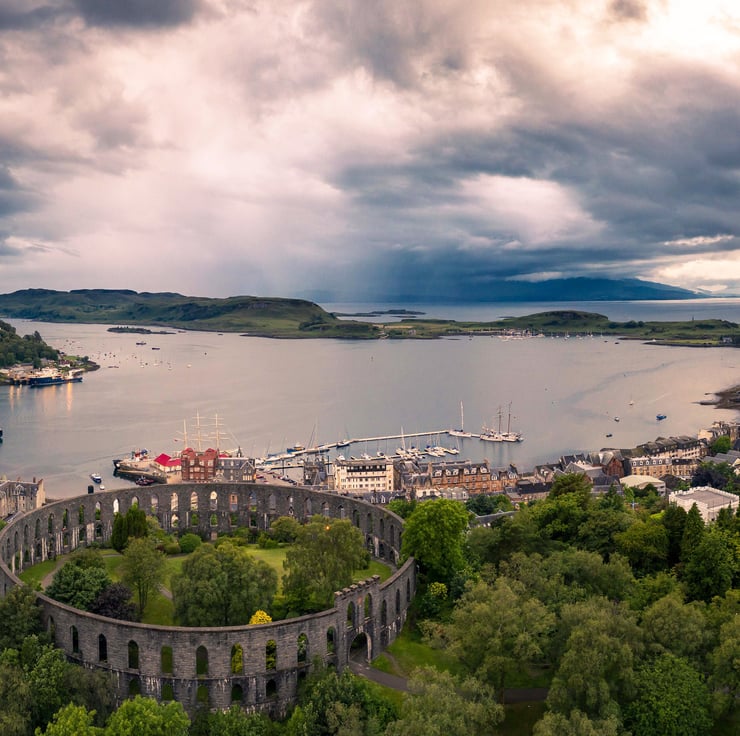 Image: "McCaig's Tower" - McCaig's Tower above Oban and Oban Bay at sunset, 15 June 2019 - by Scotland photographer Neil Barr