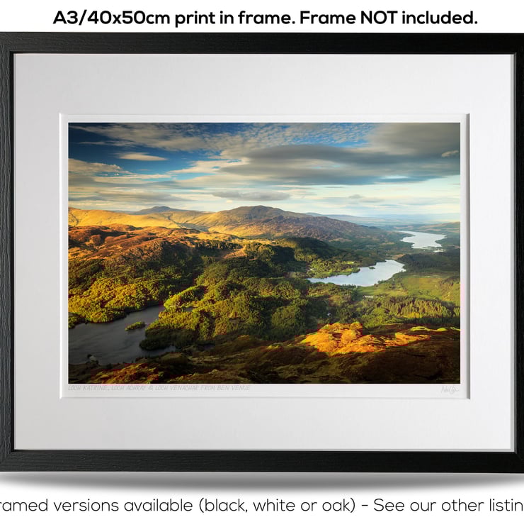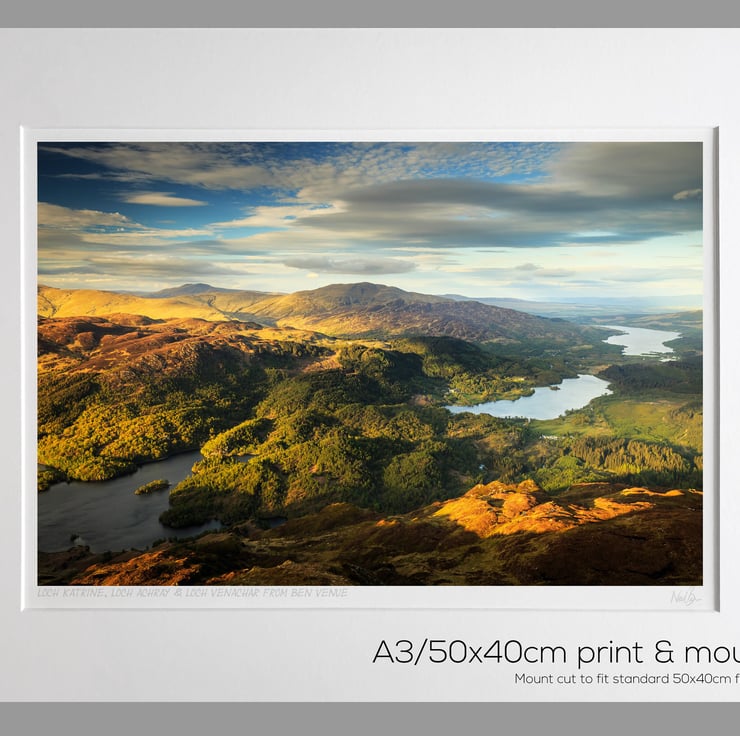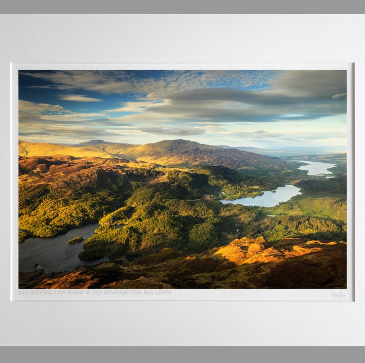 Image: "Three Lochs" - Loch Katrine, Loch Achray & Loch Venachar from summit of Ben Venue, 25 May 2015 - by Scotland photographer Neil Barr
