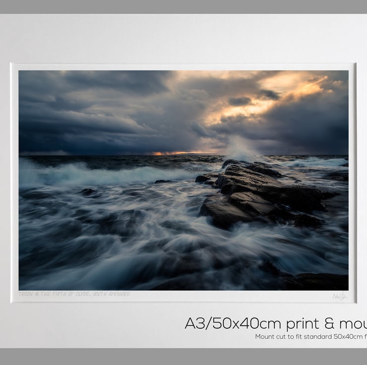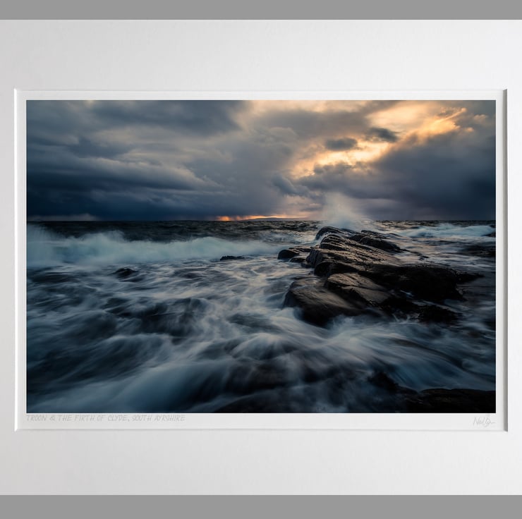 Image: "Stormy Sunset" - The Firth of Clyde and waves over rocks at Troon Ballast bank, Ayrshire, 20 February 2015 - by Scotland photographer Neil Barr