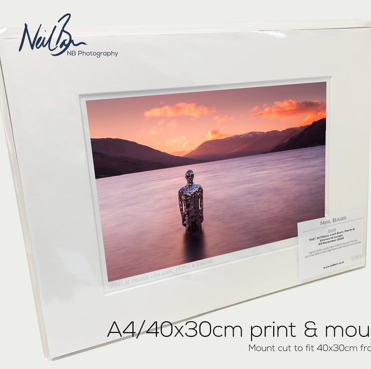 Supplied already mounted, wrapped & with signed labels & certificate, the image is printed on A4 size fine art paper (210x297mm). The actual image size is smaller (see listing images for sizes - image approx. 268x179mm) to allow for the signature & inscription. The 100% acid-free mount is cut to fit standard ready-made frames from high street stores. EXTERNAL mount size is 40cm x 30cm. This is the OUTSIDE size of the mount (and thus the size your frame should be).