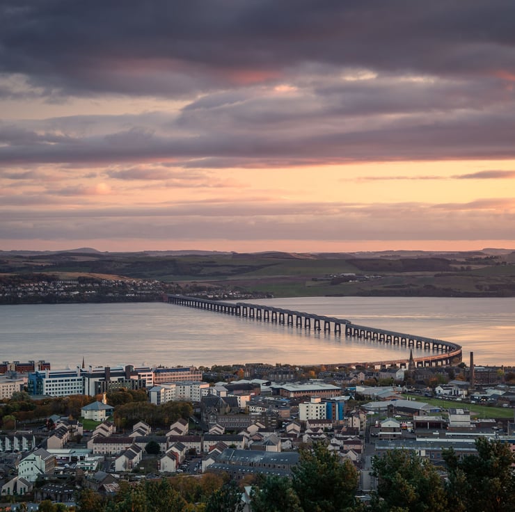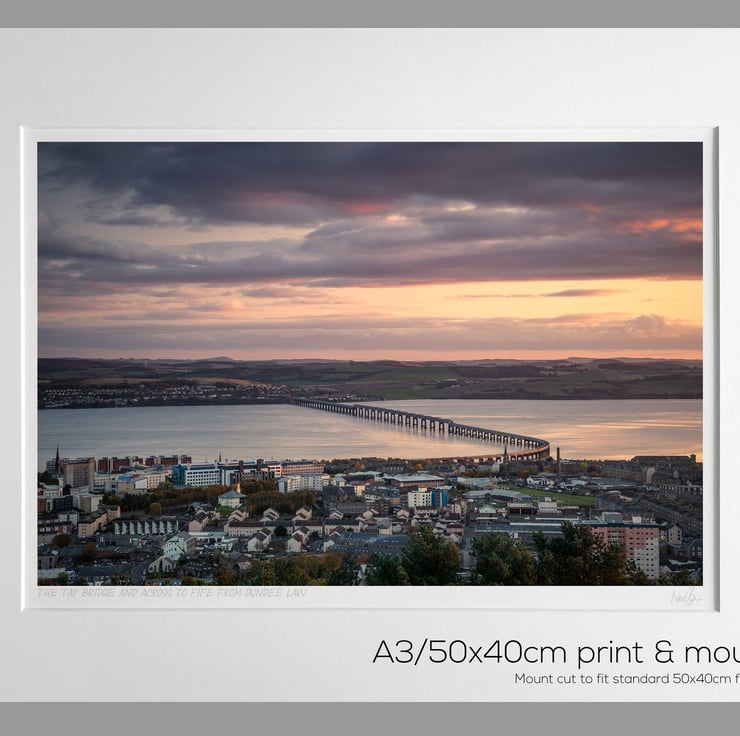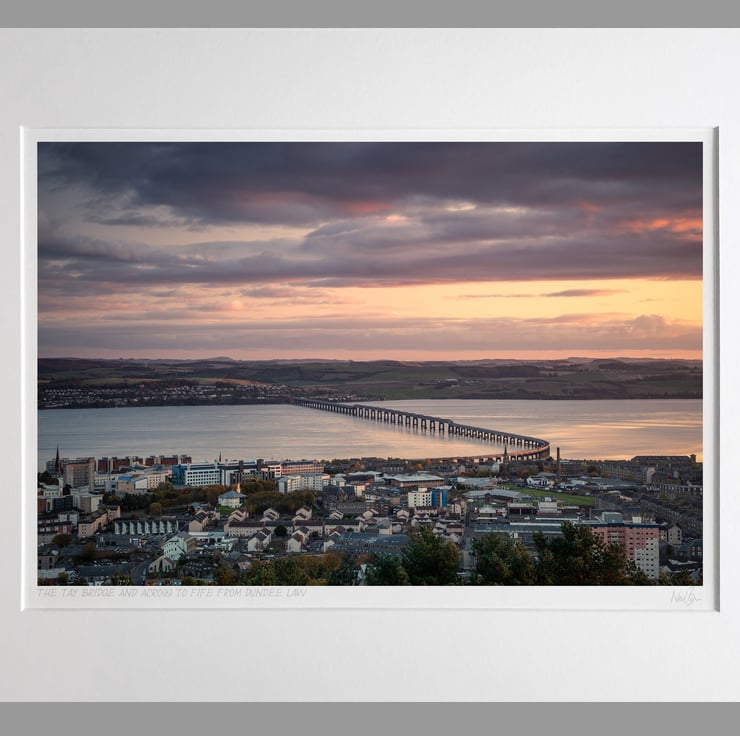 Image: "The Tay Bridge" - The Tay Bridge and across to Fife from Dundee Law at sunset, 28 October 2019 - by Scotland photographer Neil Barr