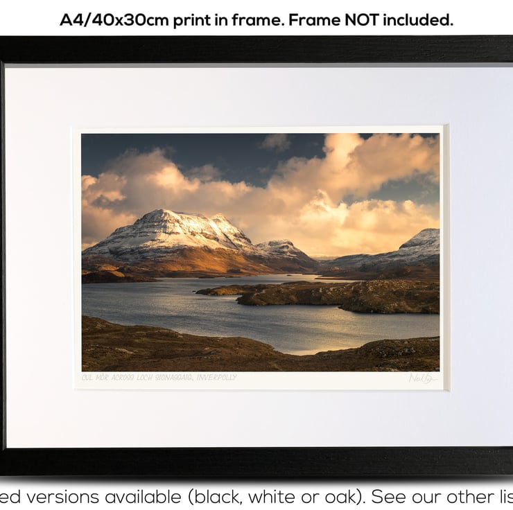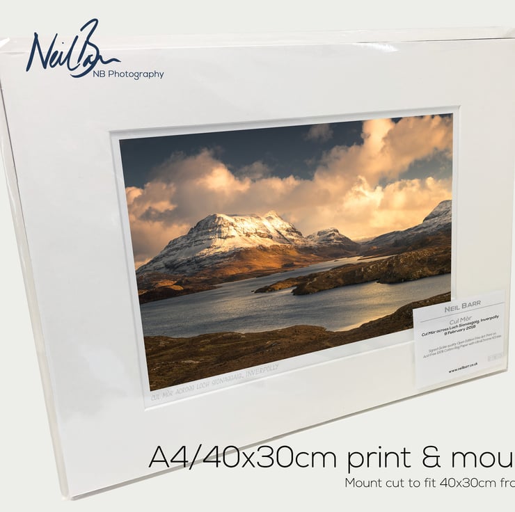 Supplied already mounted, wrapped & with signed labels & certificate, the image is printed on A4 size fine art paper (210x297mm). The actual image size is smaller (see listing images for sizes - image approx. 268x179mm) to allow for the signature & inscription. The 100% acid-free mount is cut to fit standard ready-made frames from high street stores. EXTERNAL mount size is 40cm x 30cm. This is the OUTSIDE size of the mount (and thus the size your frame should be).