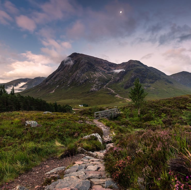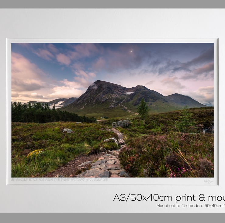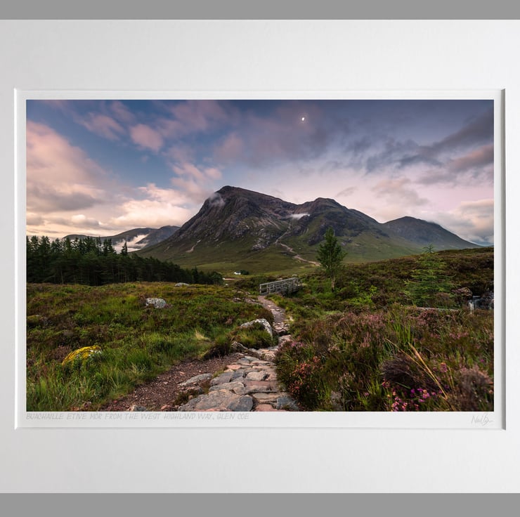 Image: "Buachaille Etive Mor" - Moon over Buachaille Etive Mor at dawn from the West Highland Way near the Devil's Staircase, 8 August 2020 - by Scotland photographer Neil Barr