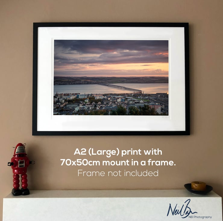 Supplied already mounted, wrapped & with signed labels & certificate, the image is printed on A2 size fine art paper (420x594mm). The actual image size is smaller (see listing images for sizes - image approx. 53x35cm) to allow for the signature & inscription. The 100% acid-free mount is cut to fit standard ready-made frames from high street stores. EXTERNAL mount size is 70cm x 50cm. This is the OUTSIDE size of the mount (and thus the size your frame should be).