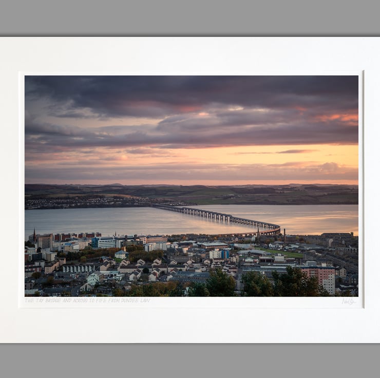 Image: "The Tay Bridge" - The Tay Bridge and across to Fife from Dundee Law at sunset, 28 October 2019 - by Scotland photographer Neil Barr