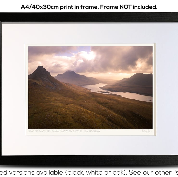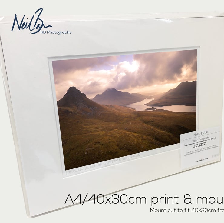 Supplied already mounted, wrapped & with signed labels & certificate, the image is printed on A4 size fine art paper (210x297mm). The actual image size is smaller (see listing images for sizes) to allow for the signature & inscription. The 100% acid-free mount is cut to fit standard ready-made frames from high street stores. EXTERNAL mount size is 40cm x 30cm. This is the OUTSIDE size of the mount (and thus the size your frame should be).