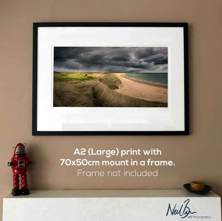 Supplied already mounted, wrapped & with signed labels & certificate, the image is printed on A2 size fine art paper (420x594mm). The actual image size is smaller (see listing images for sizes - image approx. 53x28cm) to allow for the signature & inscription. The 100% acid-free mount is cut to fit standard ready-made frames from high street stores. EXTERNAL mount size is 70cm x 50cm. This is the OUTSIDE size of the mount (and thus the size your frame should be).