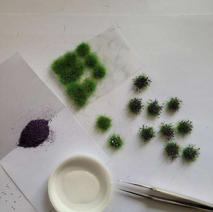 See the pictures to see how to make these into 148th flowering plants by dipping the tips into slightly diluted tacky glue and then into the Fine Flowers scatter. The pictures show purple for lavender, but try different colours for the effect of different plants.