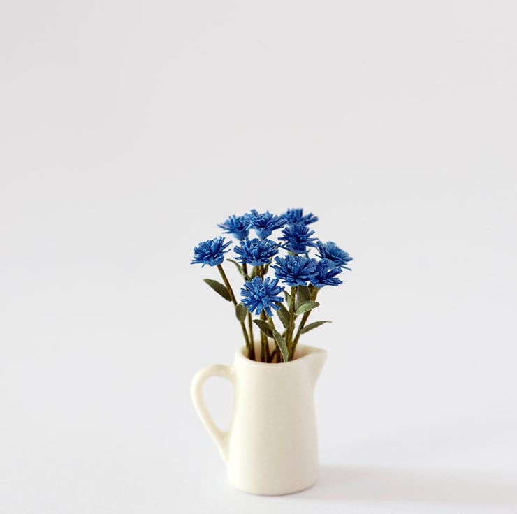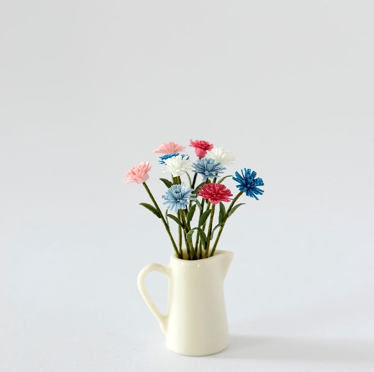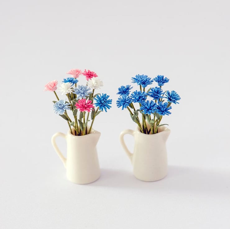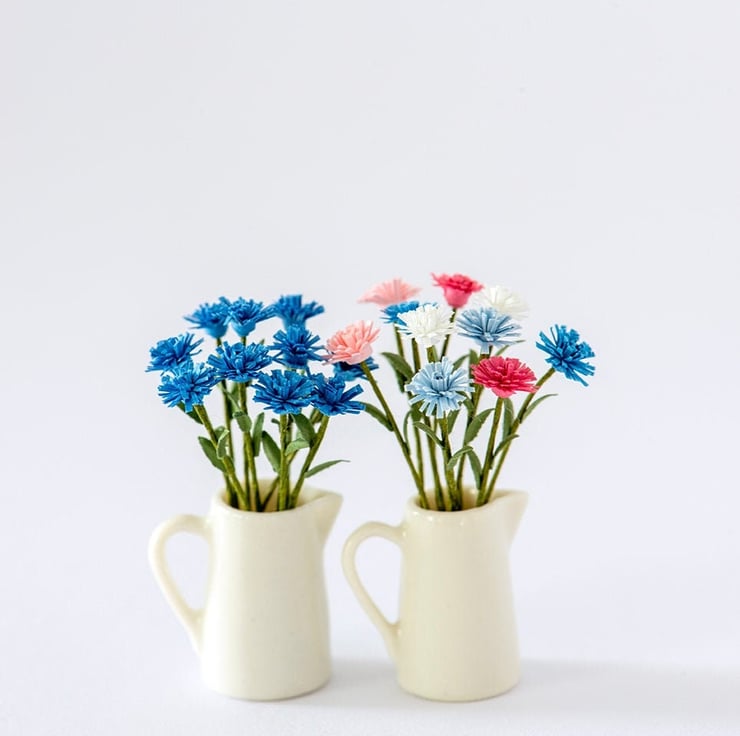 A 1/12th or 1" scale paper flower kit to make 10 Cornflowers. Now in two colours. blue or mixed pastels. both colours now have leaves.
