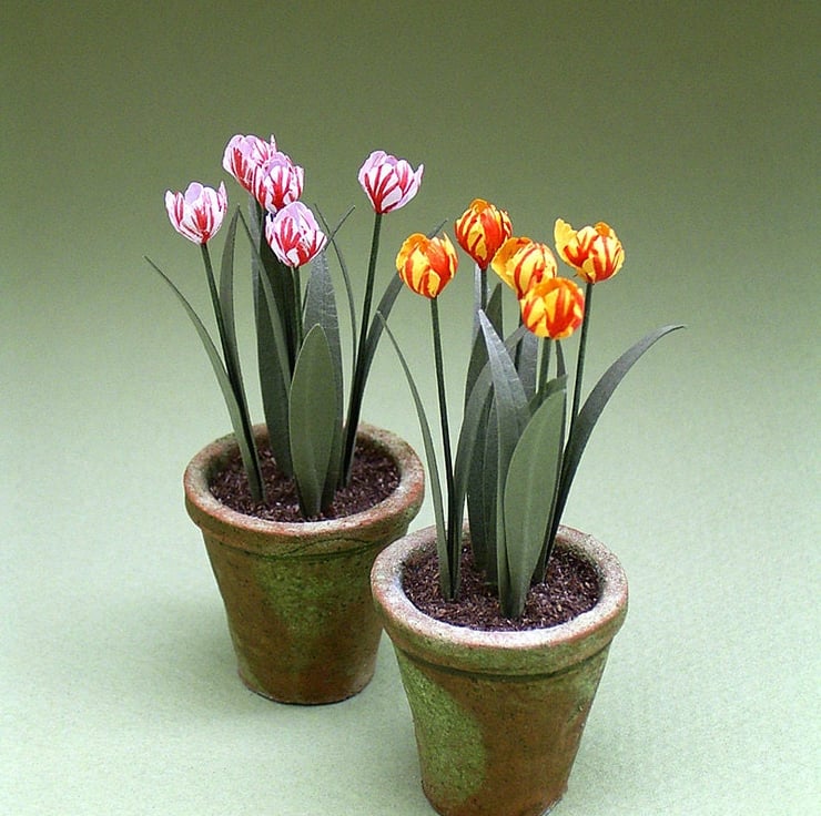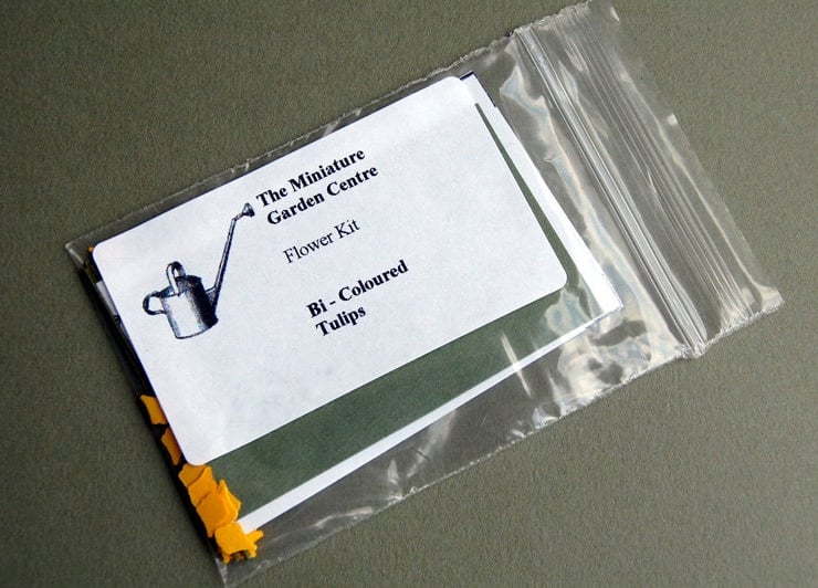 A 1/12th or 1" scale paper flower kit to make 5 Bi-Coloured Tulips in either white or yellow. The red stripes are drawn on with a fine pointed felt tip pen.