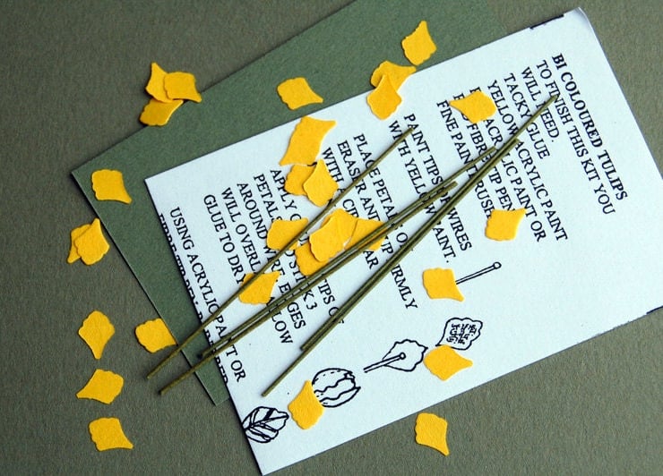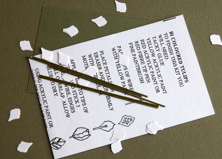 The kit includes punched coloured paper petals, paper for the leaves, wires and illustrated instructions.