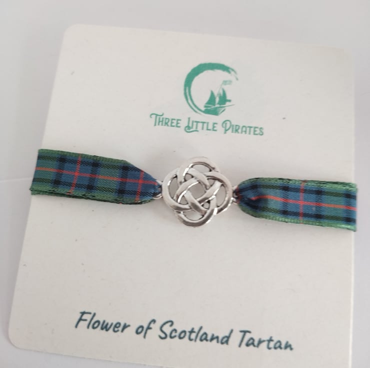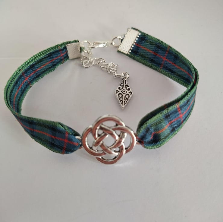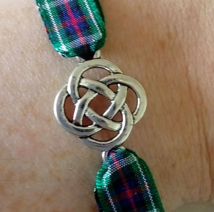 Tartan ribbon bracelet with silver coloured Celtic knot inlay.