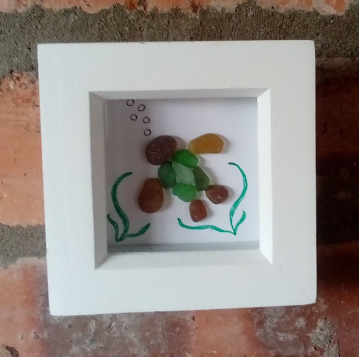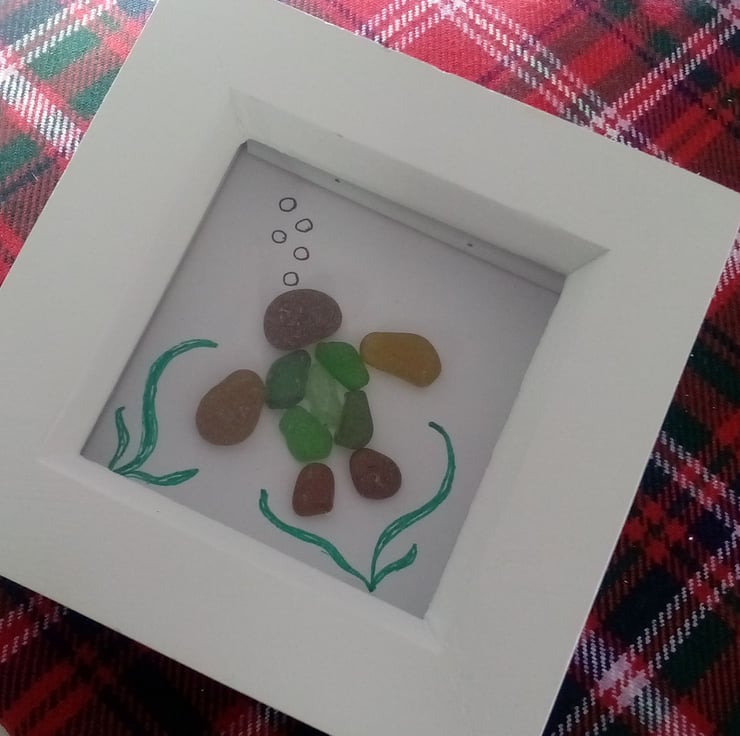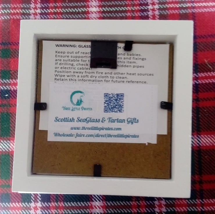 This is a cute little 3" x 3" frame with glass front. I collect all my own seaglass from the West coast of Scotland.