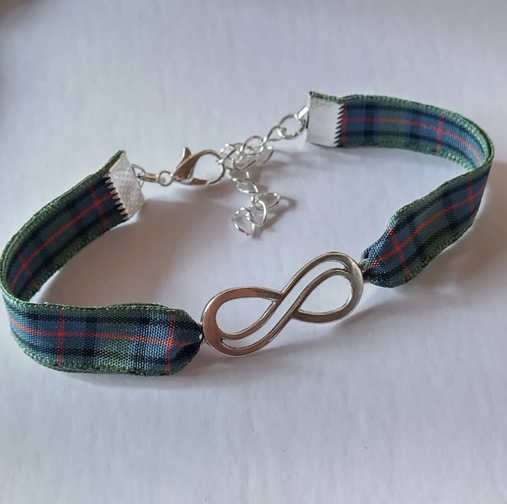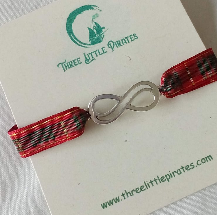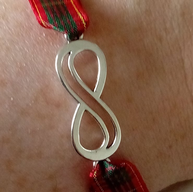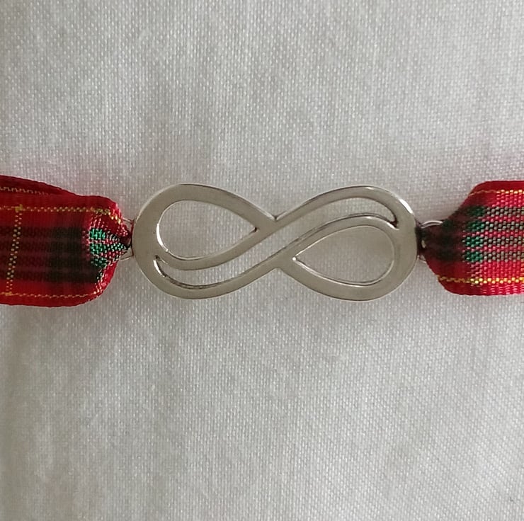 Tartan ribbon bracelet with silver coloured Infinity knot and heart inlay.