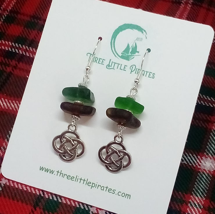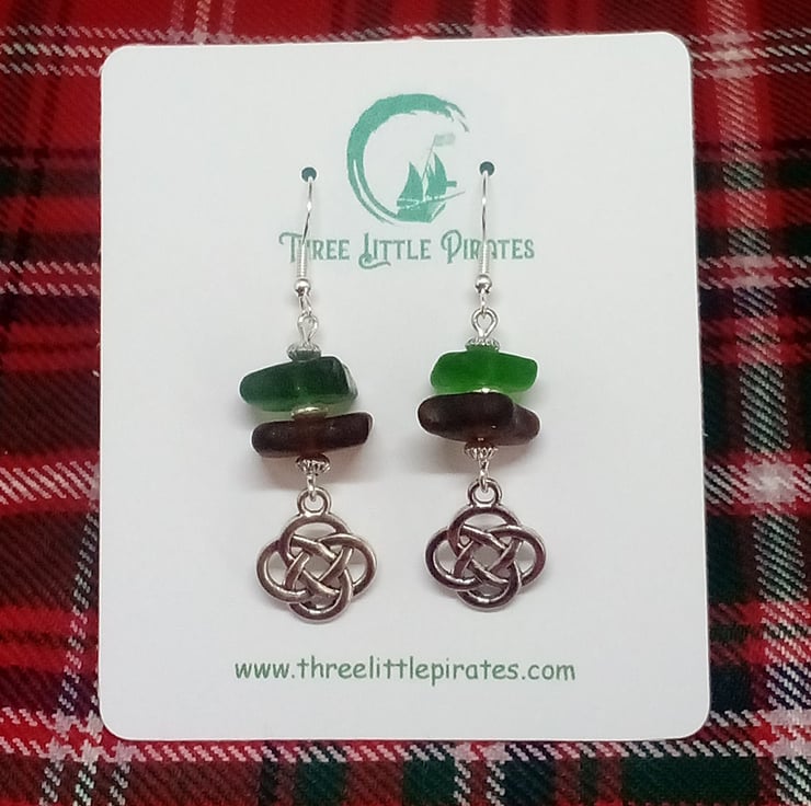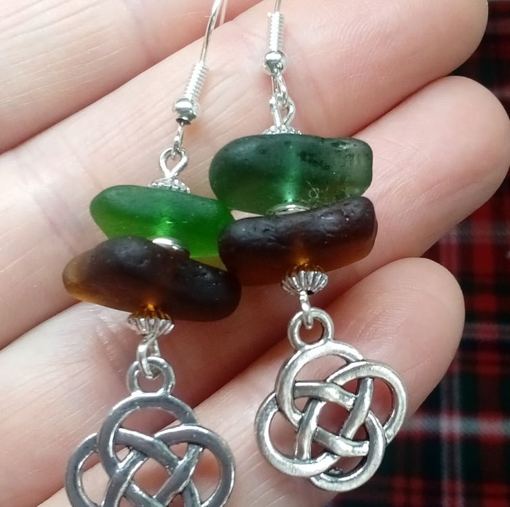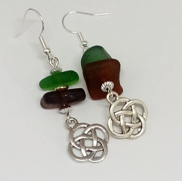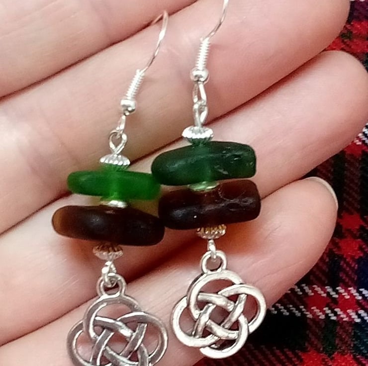 Dangly earrings made from green and brown sea glass found on our local beach in Scotland.