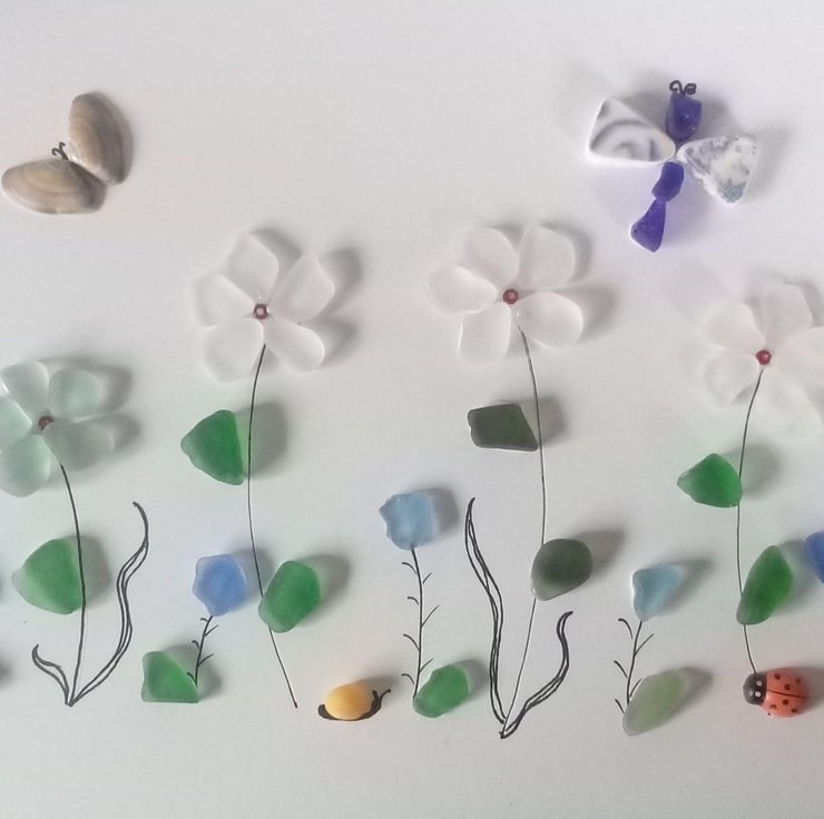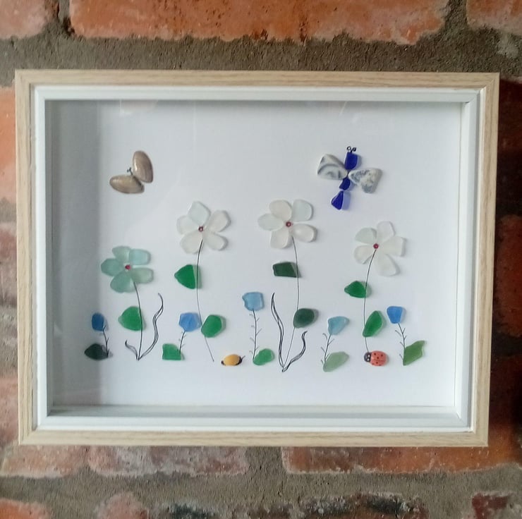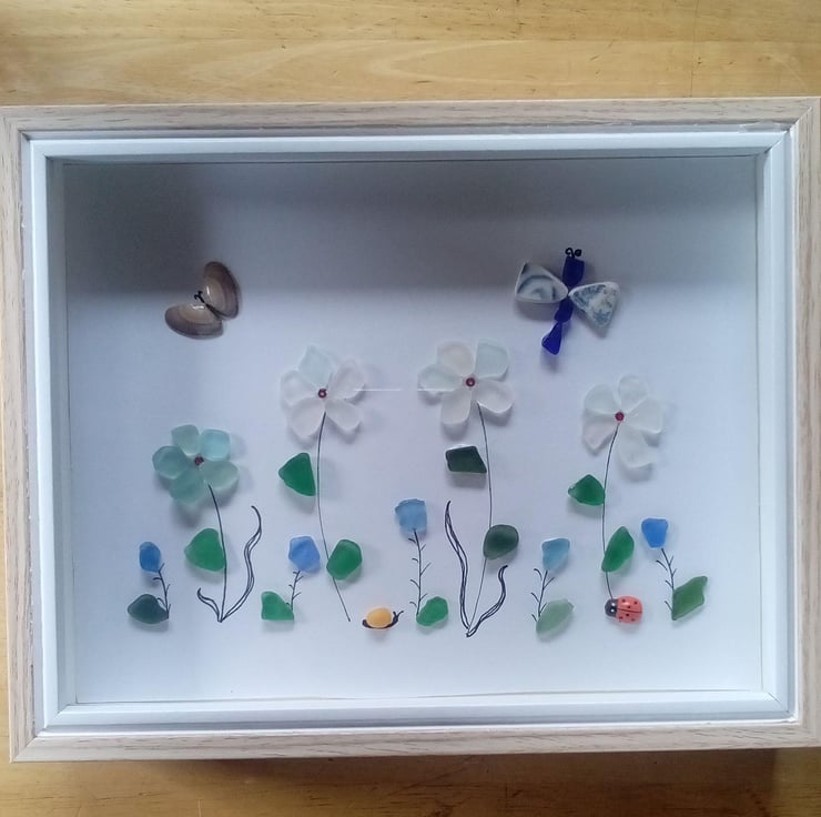 Seaglass flower meadow with butterfly, dragonfly and seashell snail. in a deep frame with glass front.