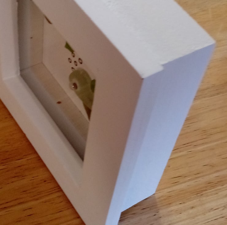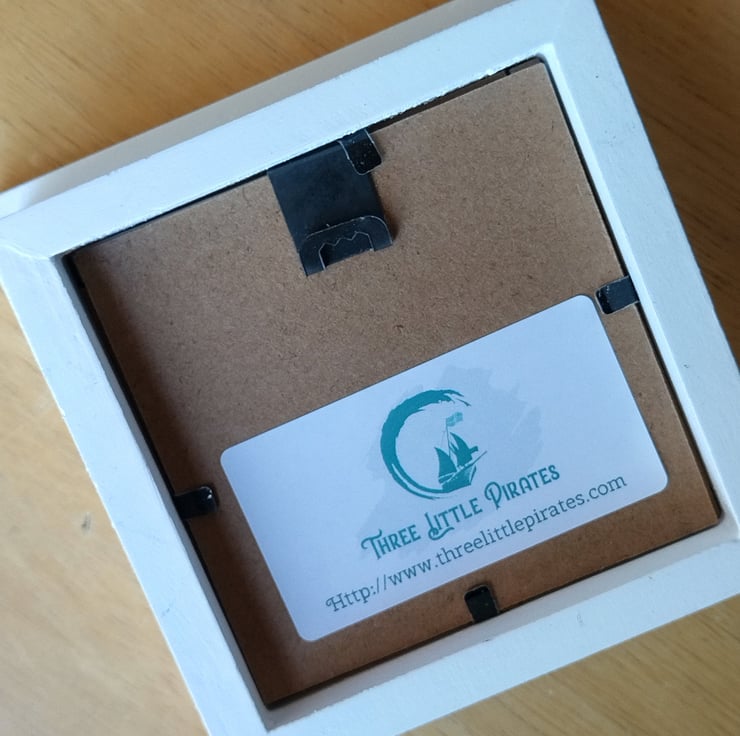 The picture is framed in a 3 x 3 wooden box frame. The picture can be wall mounted or freestanding.