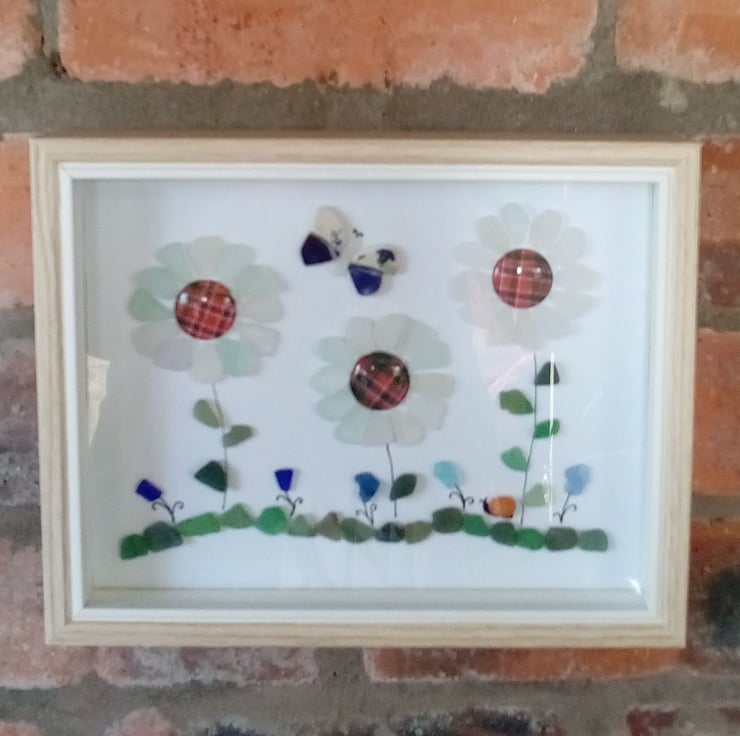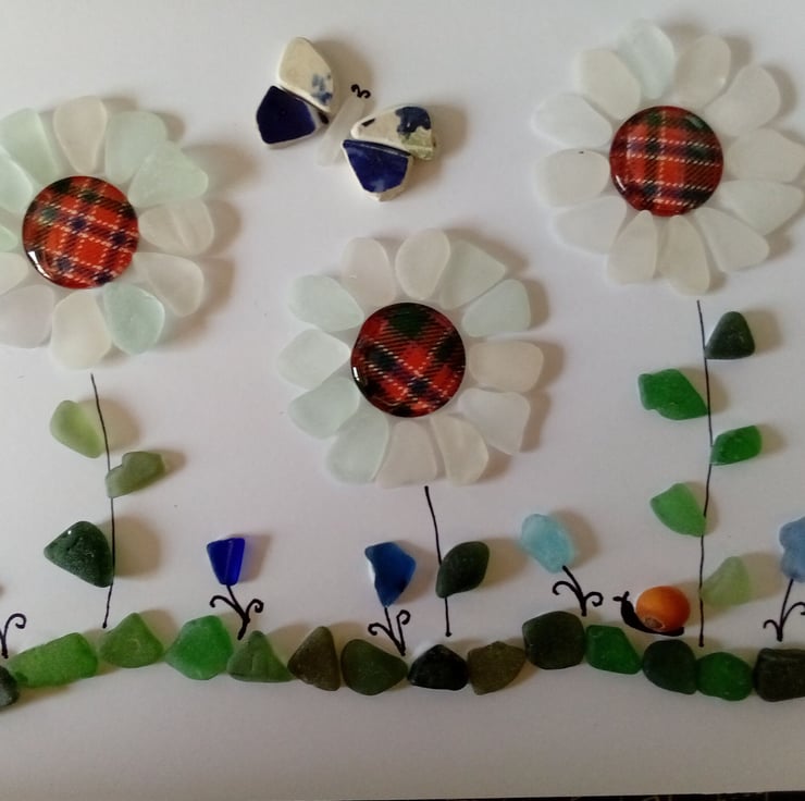 Seaglass flower meadow with pottery butterfly and seashell snail.