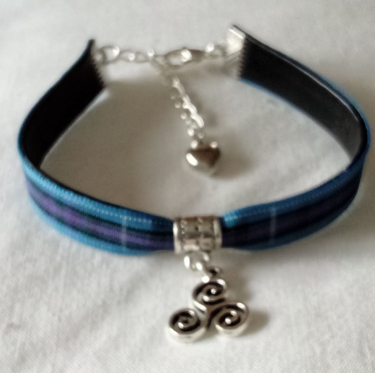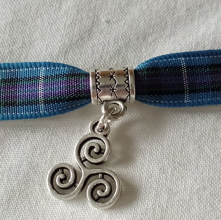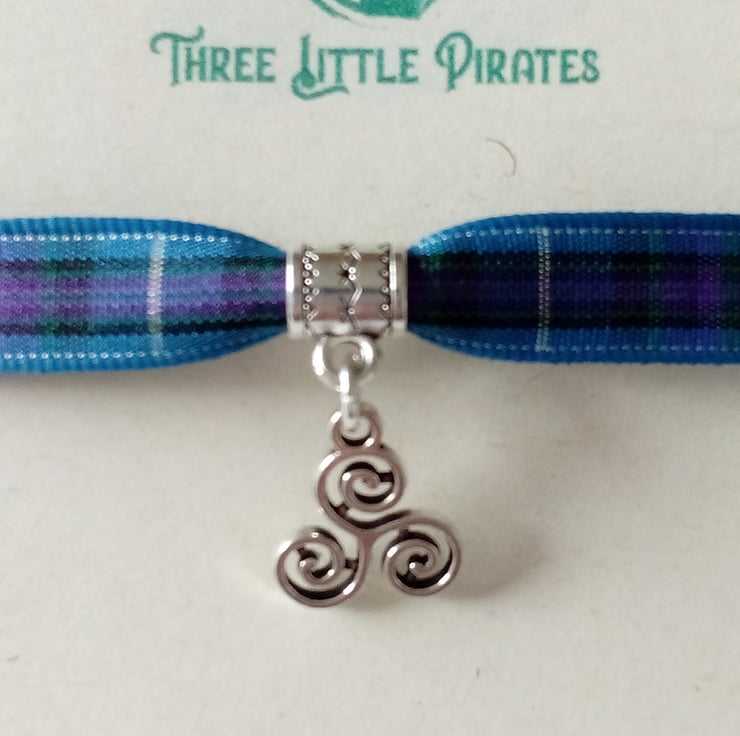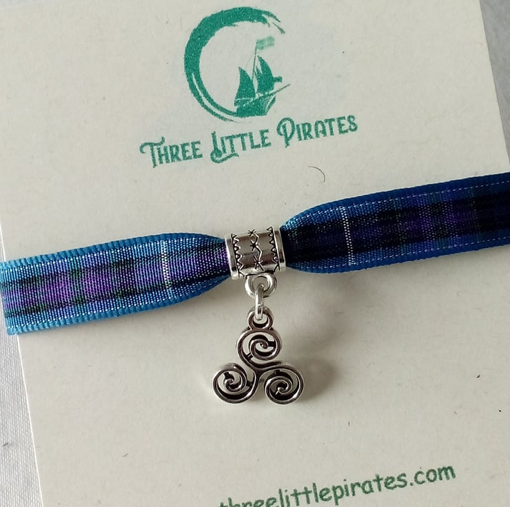 Tartan ribbon bracelet with silver coloured Celtic Triskelion spiral.